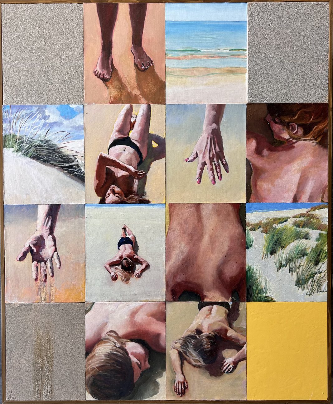 “In questo viaggio – osserva Sabrina Di Gesaro – ogni pannello è una tappa, un pezzo del puzzle che compone una visione complessiva dell’arte come esperienza totalizzante e multisensoriale: i tasselli dei suoi quadri polittici sono frames, frequenze di immagini tratte da un film, accostamenti di foto come un feed di instagram”.