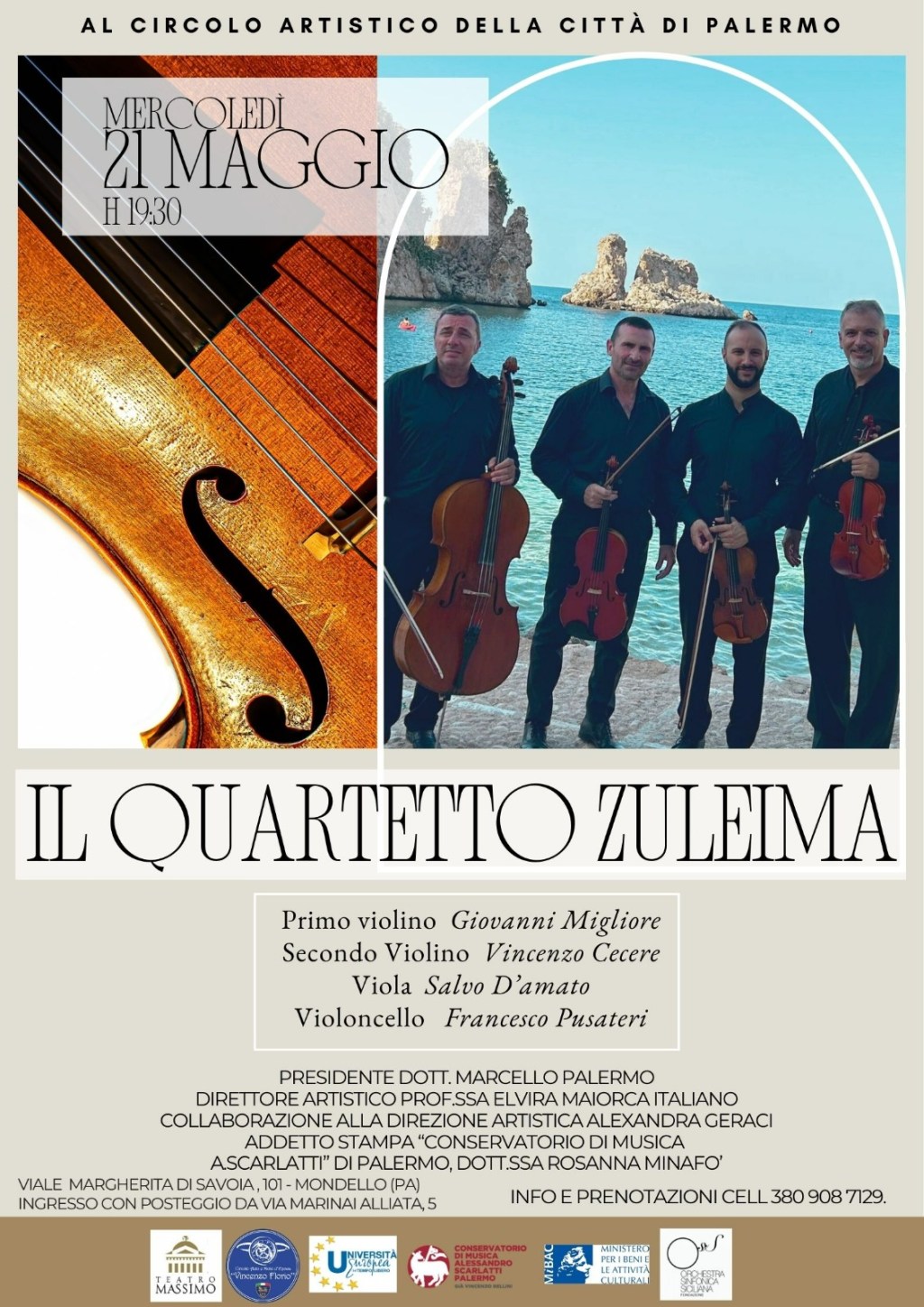 Continua con successo l’attività culturale e musicale al Circolo Artistico Città di Palermo, fondato nel 1882, con il presidente dott. Marcello Palermo, grazie all’appuntamento voluto fortemente dalla direzione artistica, Elvira Maiorca Italiano, con lo spettacolo del Quartetto Zuleima, mercoledì 21 maggio alle ore 19.30. Continua così il ciclo delle attività all’interno del Circolo che porta la firma della professoressa Elvira Maiorca Italiano, la collaborazione artistica Alexandra Geraci, la segretaria Domenico Ruisi.