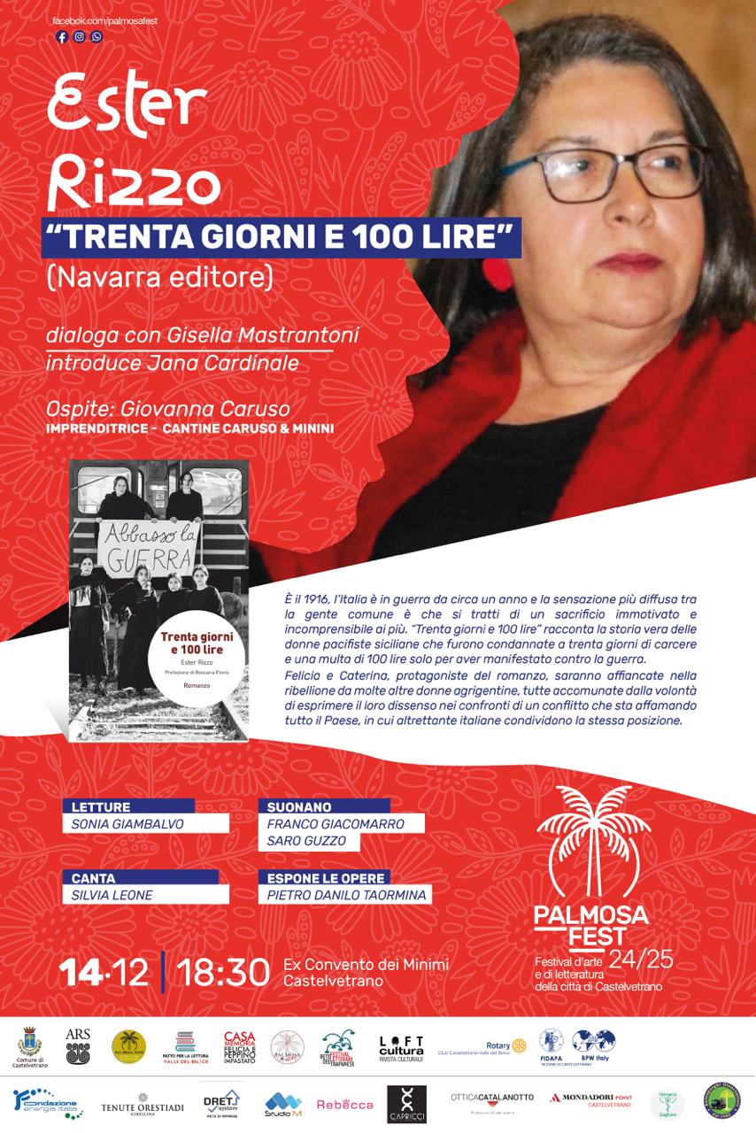 Terzo appuntamento, sabato 14 dicembre, con il «PalmosaFest», la rassegna di arte e letteratura ideata da Bia Cusumano, con la direzione culturale della giornalista Jana Cardinale. All’ex convento dei minimi, a partire dalle 18,30, verrà presentato «Trenta giorni e 100 lire» (Navarra editore), di Ester Rizzo.
