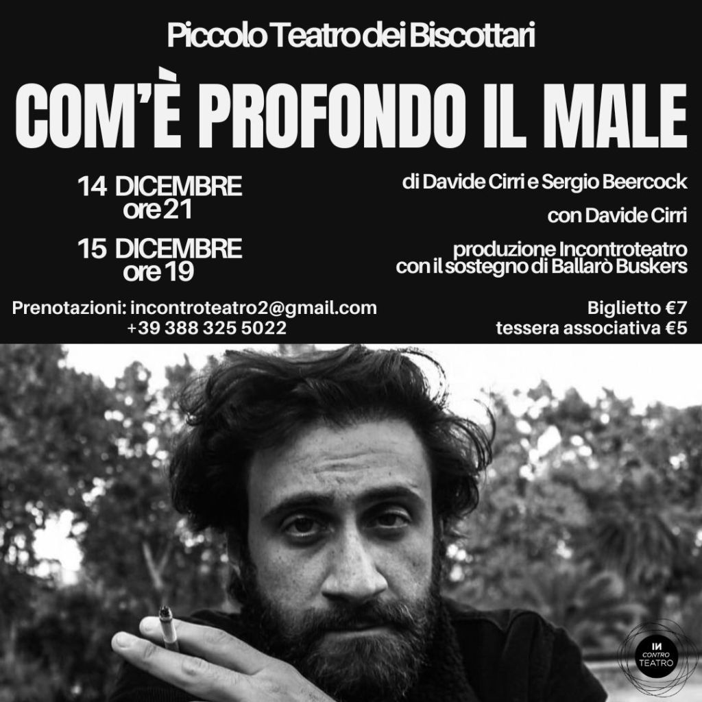 Dove vanno le persone sole? Da dove vengono? Due interrogativi che ci si pone quando si cerca un senso alla propria vita, provando a capire quella degli altri. Domande che portano con loro il peso della solitudine e del karma che spesso non si dimostra benevolo. Trae ispirazione da un’esperienza realmente accaduta “Com’è profondo il male”, lo spettacolo di Davide Cirri e Sergio Beercock, in scena alle 21 di sabato 14 e alle 19 di domenica 15 dicembre al Piccolo Teatro dei Biscottari, in via dei Biscottari 27.