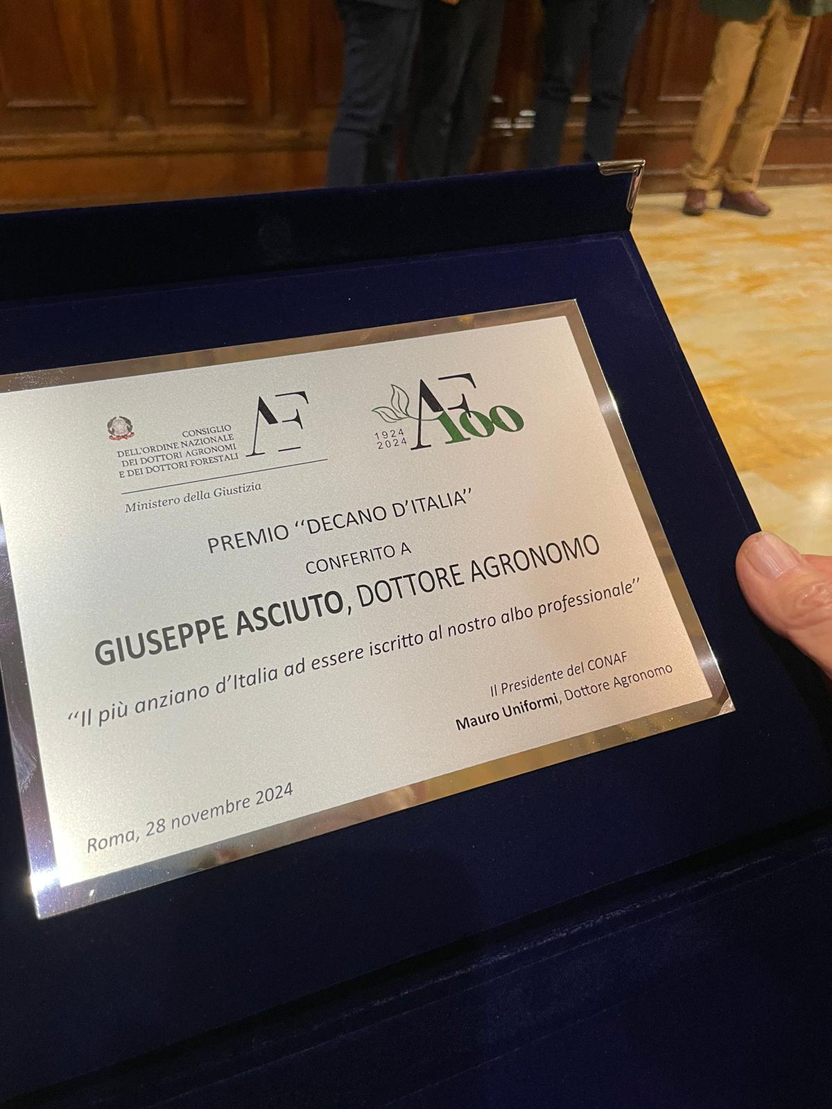 Il professore Giuseppe Asciuto è stato insignito “Decano d’Italia”, riconoscimento assegnato dal Consiglio dell’Ordine Nazionale, in occasione della cerimonia di celebrazione dei cento anni del Regio Decreto 30 novembre 1924 n. 2172 dell’istituzione degli esami di Stato per l’abilitazione alla professione di dottore agronomo e forestale, presso Palazzo Valentini, a Roma.