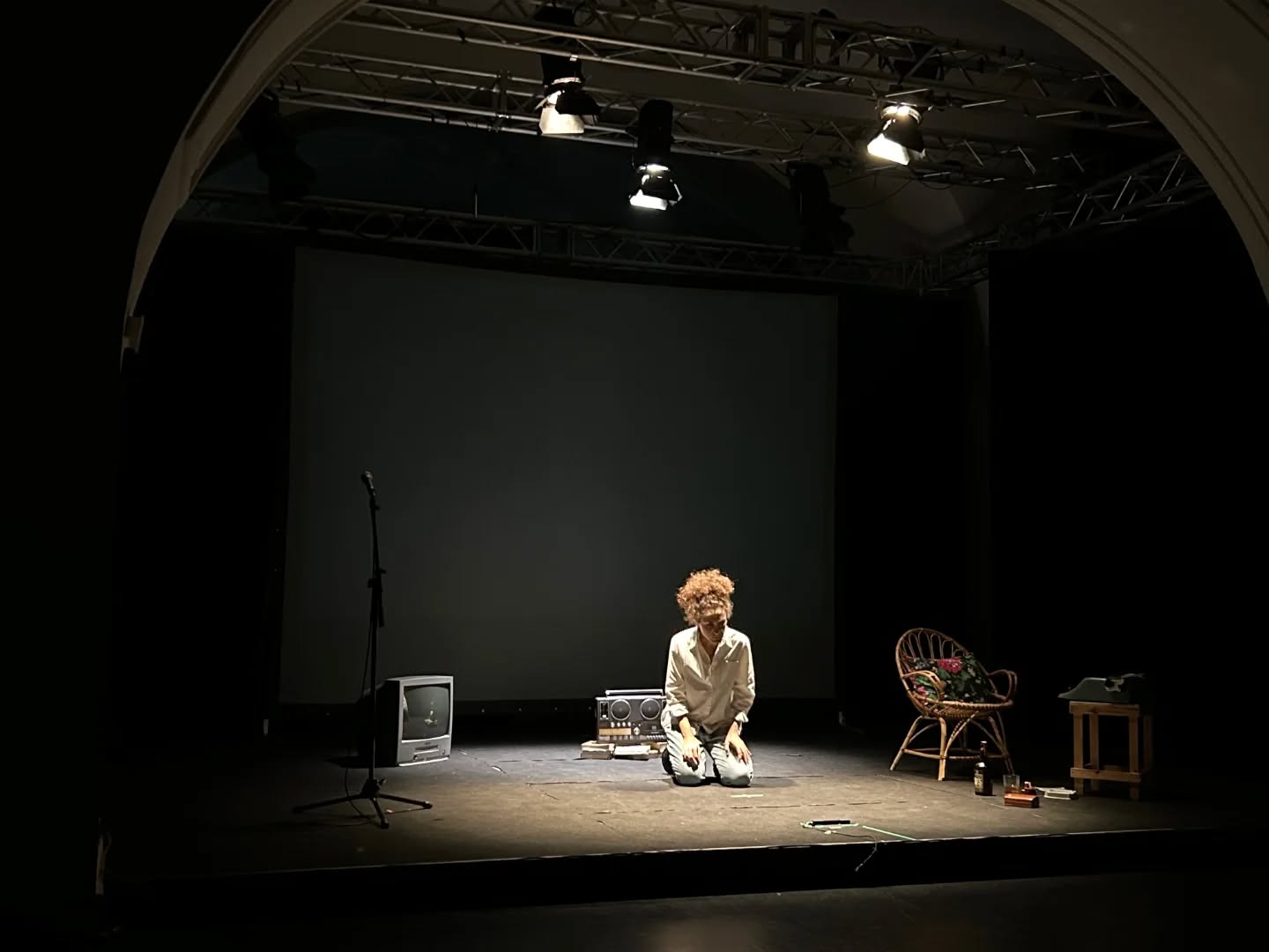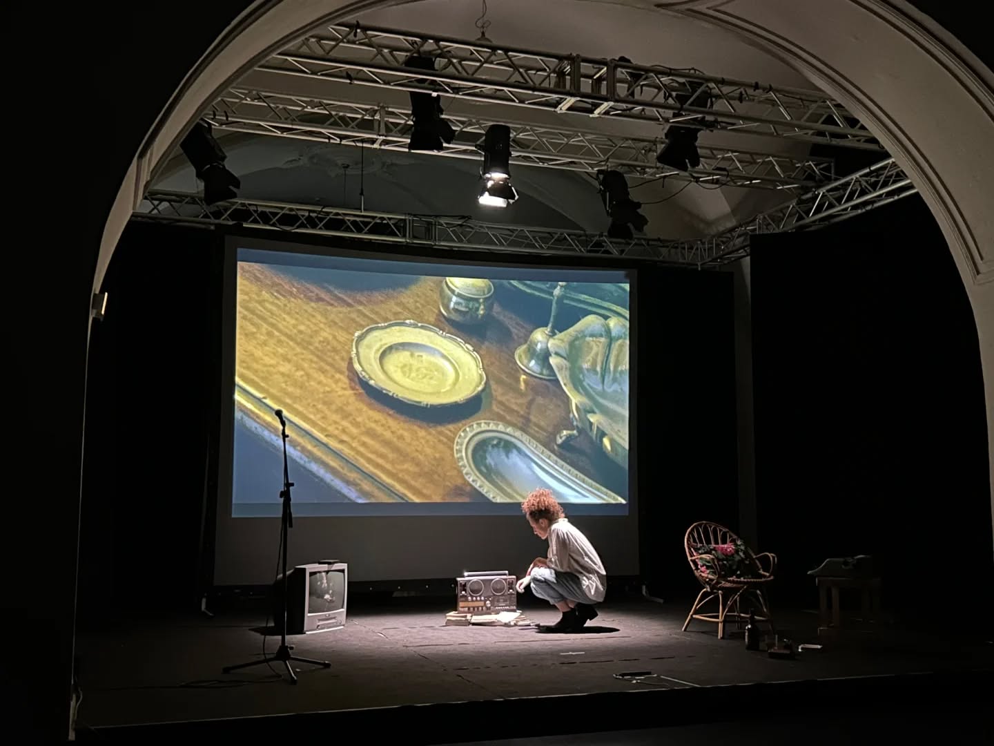 Da una macchina da scrivere, una radio mangianastri, una vecchia TV si diffondono interferenze di voci e immagini che entrano in dialogo con l’interprete, modificando la struttura monologante dello spettacolo in un’architettura a più voci. Completa il disegno una ripresa video che trasforma il dato narrativo in presenza finzionale digitale. Non è Goliarda la protagonista dello spettacolo, ma la Goliarda per quello che ci ha lasciato di sé nella sua opera e per la riserva di fantasmi che in essa è custodita. Questa in fondo non è altro che una festa dei morti!