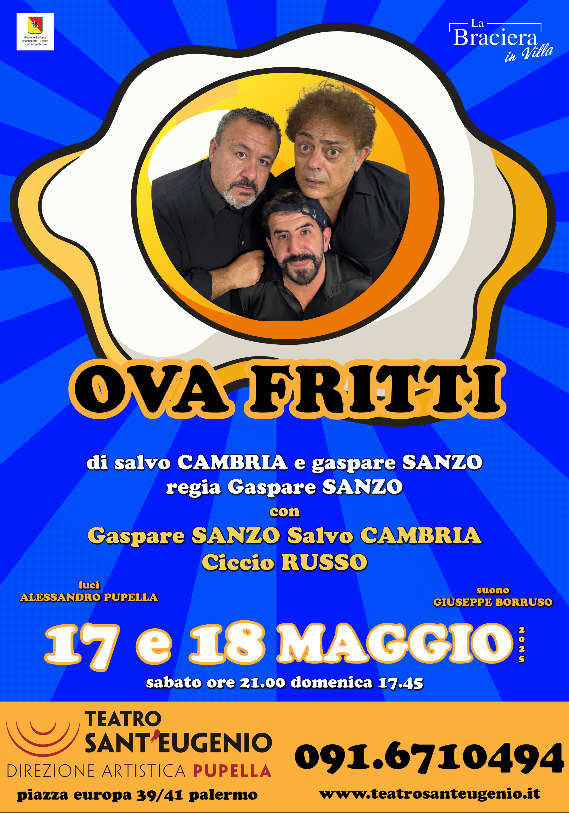 Sabato 17 e domenica 18 maggio, al teatro Sant’Eugenio di Palermo – Direzione artistica Pupella, sarà protagonista la commedia ‘’Ova fritti’’ di Salvo Cambria e Gaspare Sanzo, interpreti insieme a Ciccio Russo, per la regia di Gaspare Sanzo.