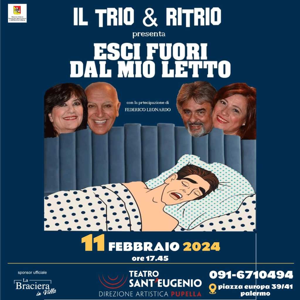 Al teatro Sant’Eugenio – Direzione artistica Pupella di piazza Europa 39/41 a Palermo, domenica 11 febbraio, alle ore 17.45, arriva la Compagnia Trio e Ritrio che metterà in scena la nuova commedia brillante dal titolo “Esci fuori dal mio letto”.