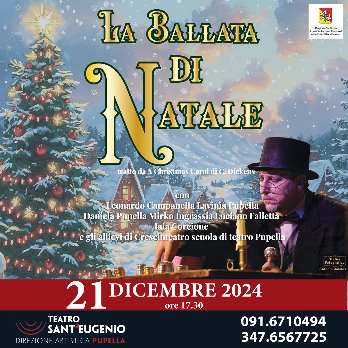 Sabato 21 dicembre, alle ore 17.30, al teatro Sant’Eugenio – Direzione artistica Pupella di piazza Europa 39/41, a Palermo, si rinnova l’appuntamento con lo spettacolo per famiglie e dedicato alla festività più attesa dell’anno, con la messa in scena de “La ballata di Natale”. L’opera, tratta dal Canto di Natale di Charles Dickens, è adattata e diretta da Marco Pupella e vedrà sul palco: Leonardo Campanella, Daniela e Lavinia Pupella, Luciano SergioMaria, Iaia Corcione, Mirko Ingrassia e gli Allievi di Crescinteatro della Scuola di teatro Pupella.