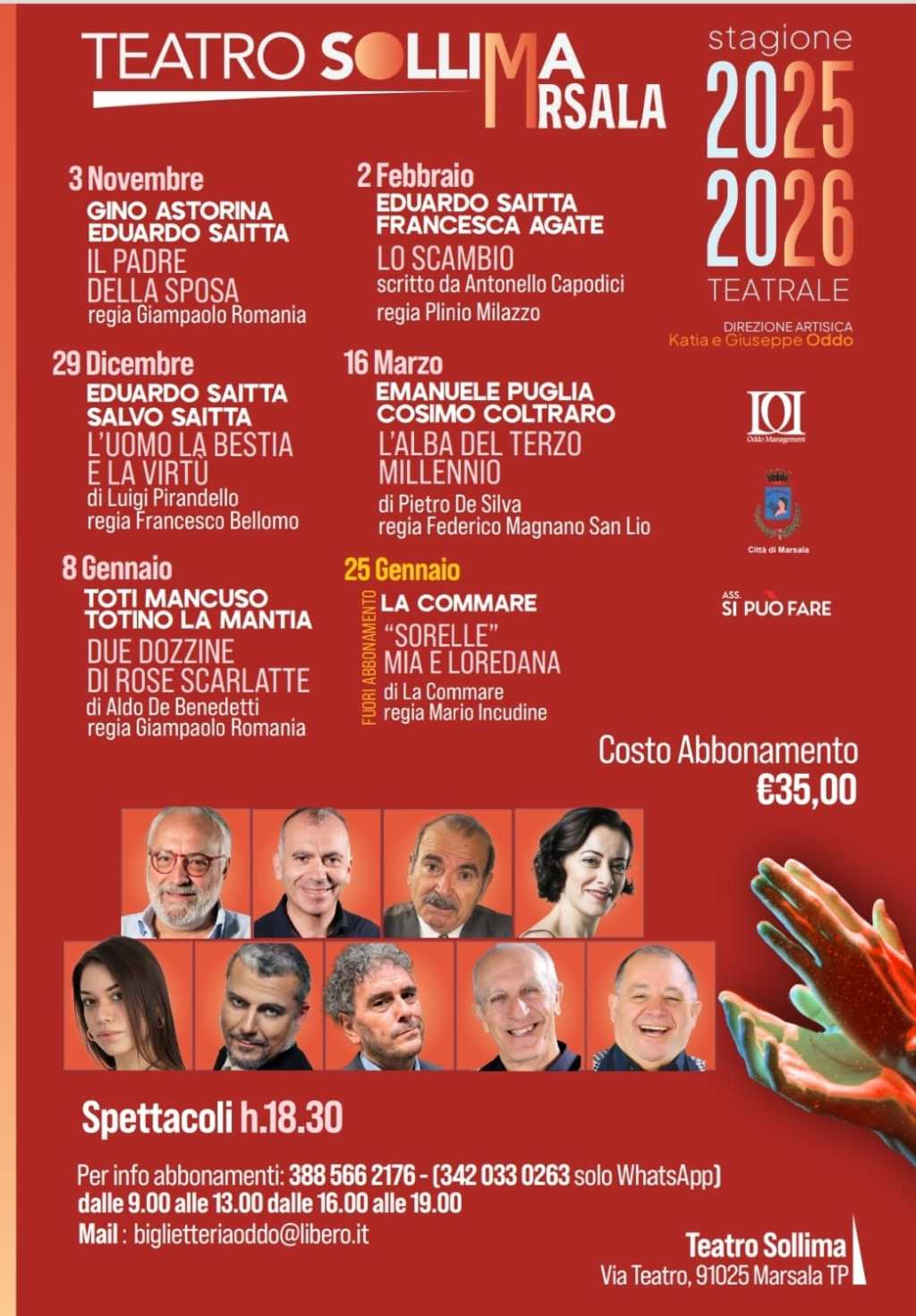Con la direzione artistica di Katia e Giuseppe Oddo (Oddo Management), Marsala si prepara a vivere una nuova e interessante programmazione teatrale. Grandi storie e grandi interpreti saranno protagonisti della Stagione Sociale Popolare 2025-2026 al Teatro Sollima: cinque spettacoli in cartellone e uno spettacolo speciale fuori abbonamento dal titolo “Sorelle – Mia e Loredana”, sulla vita di Mia Martini e Loredana Bertè, scritto e interpretato da La Commare, con la regia di Mario Incudine, che andrà in scena sabato 25 gennaio.