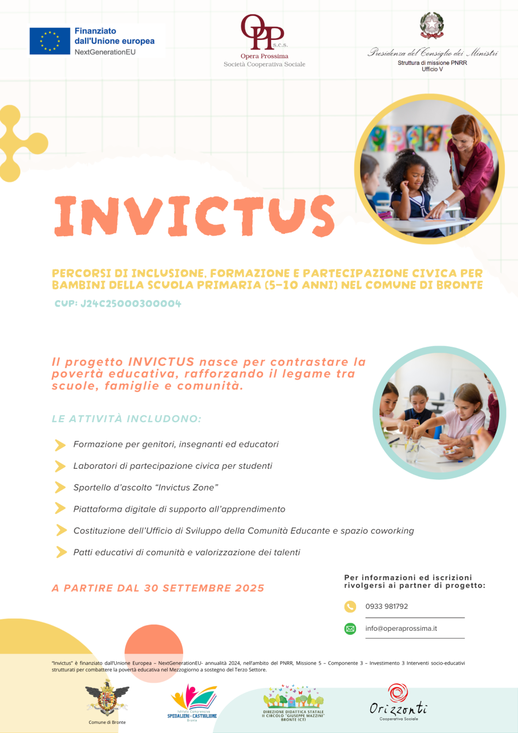 La Cooperativa Opera Prossima s.c.s., in partenariato con il Comune di Bronte, la Direzione Didattica Statale II Circolo “G. Mazzini”, l’Istituto Comprensivo Spedalieri- Castiglione e la Cooperativa sociale Orizzonti, lanciano il progetto INVICTUS – Comunità educante per il contrasto alla povertà educativa, finanziato dall’Unione Europea – NextGenerationEU, nell’ambito del PNRR – Missione 5, Componente 3, Investimento 3 annualità 2024, Dipartimento per le politiche di coesione e per il Sud – Presidenza del Consiglio dei Ministri (Struttura di missione PNRR – Ufficio V).