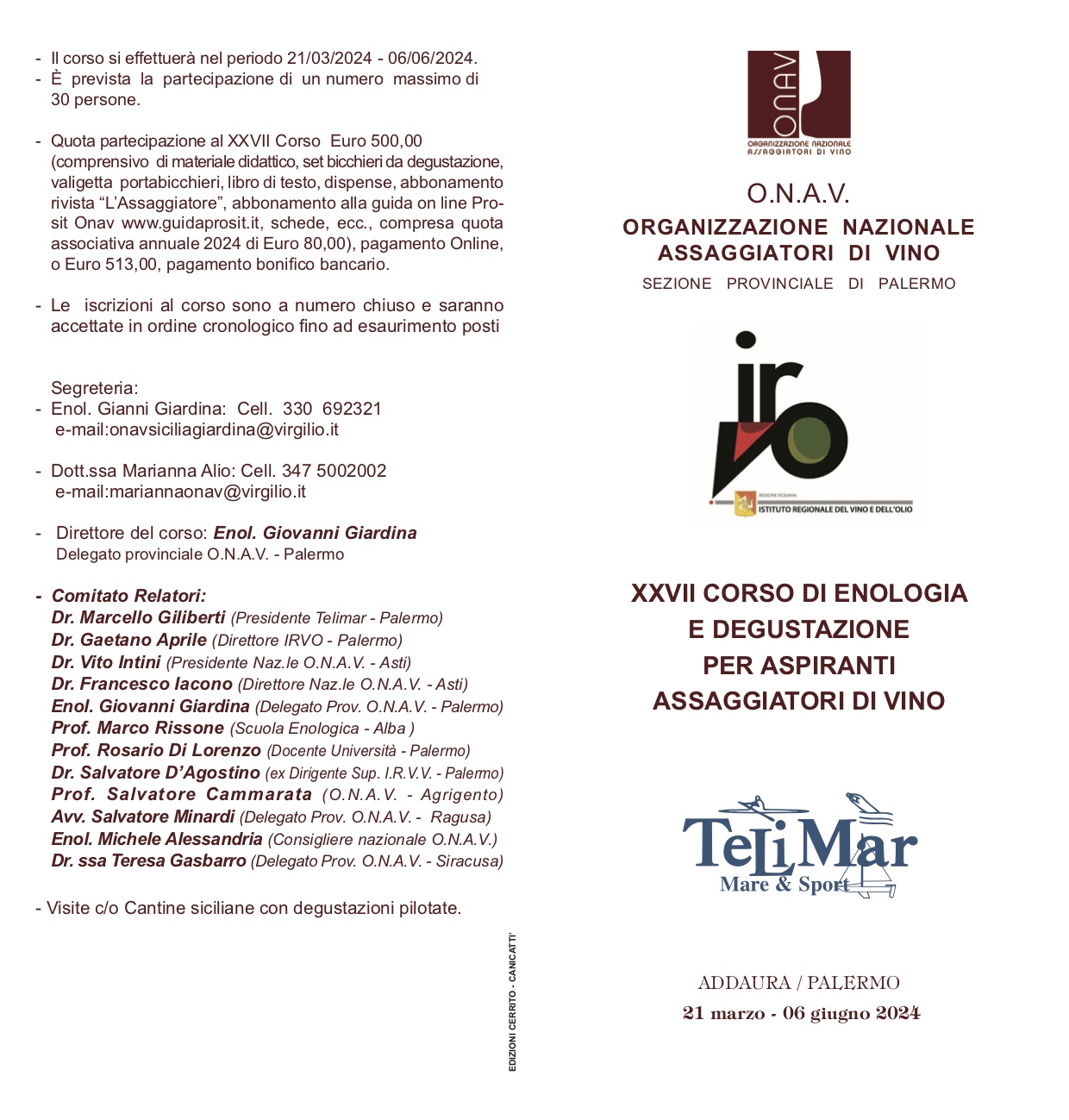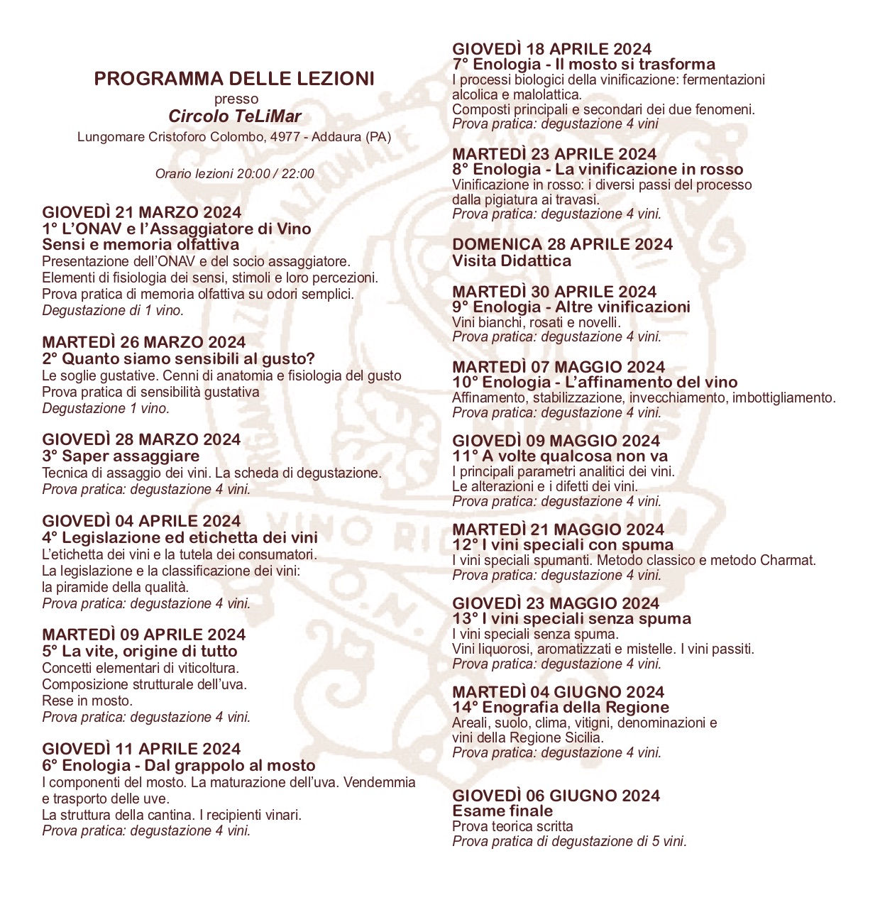 Al via dunque giovedì 21 marzo con una prima lezione dedicata a “Elementi di fisiologia dei sensi, stimoli e loro percezioni” durante la quale verrà effettuata una prova pratica di memoria olfattiva su odori semplici e la degustazione di un vino. Tutti gli incontri si terranno ogni martedì e giovedì dalle ore 20 alle ore 22 presso il Circolo Telimar (via Lungomare Cristoforo Colombo 4977 Addaura – Palermo). Il percorso didattico si concluderà in cantina dove verranno spiegati i processi produttivi e i “segreti” per ottenere un vino di qualità. Ogni incontro comprende una parte teorica e una degustazione guidata di quattro campioni di vino, rappresentativi del vitigno e del territorio, selezionati da assaggiatori esperti. Le lezioni sono tenute da relatori abilitati all’insegnamento, enologi, agronomi, esperti. I vini verranno serviti e degustati senza l’indicazione del produttore. Il corso è a numero chiuso. Dopo l’esame finale verrà rilasciato il Diploma di Patente d’Assaggiatore di Vino.