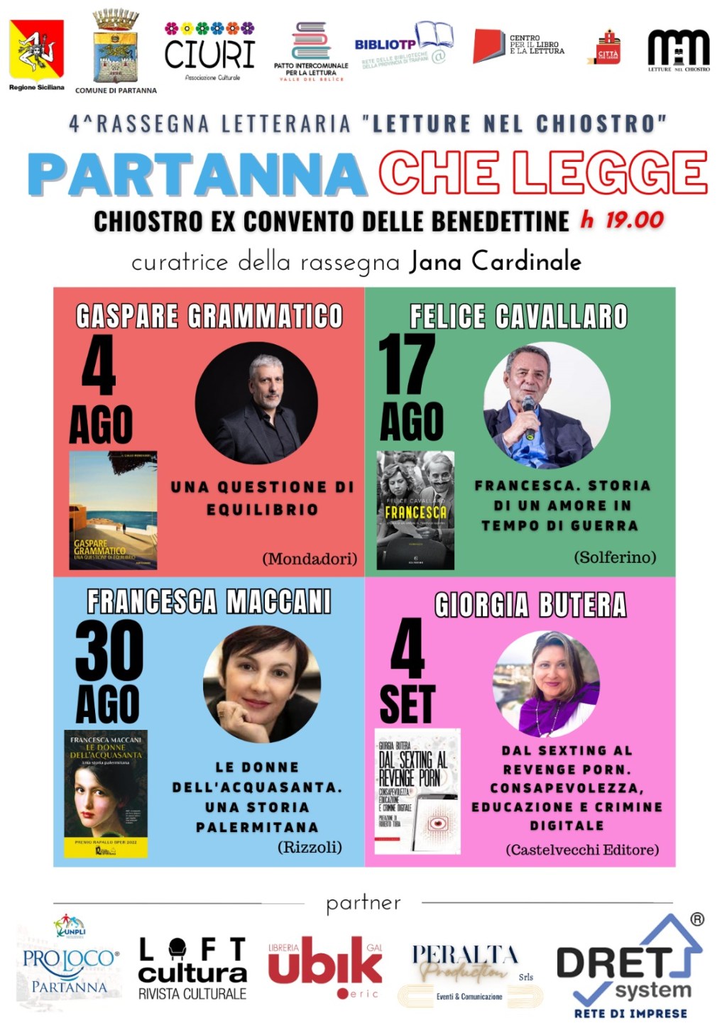 Si chiama “Letture nel Chiostro – Partanna che legge” la 4^ edizione della Rassegna letteraria estiva organizzata dall’Associazione culturale “Ciuri”, presieduta da Filippo Peralta, con il sostegno del Comune di Partanna, che si svolgerà dal 4 agosto al 4 settembre nel Chiostro dell’ex Convento delle Benedettine, dove ha sede la Biblioteca Comunale ‘Francesco Saladino’.