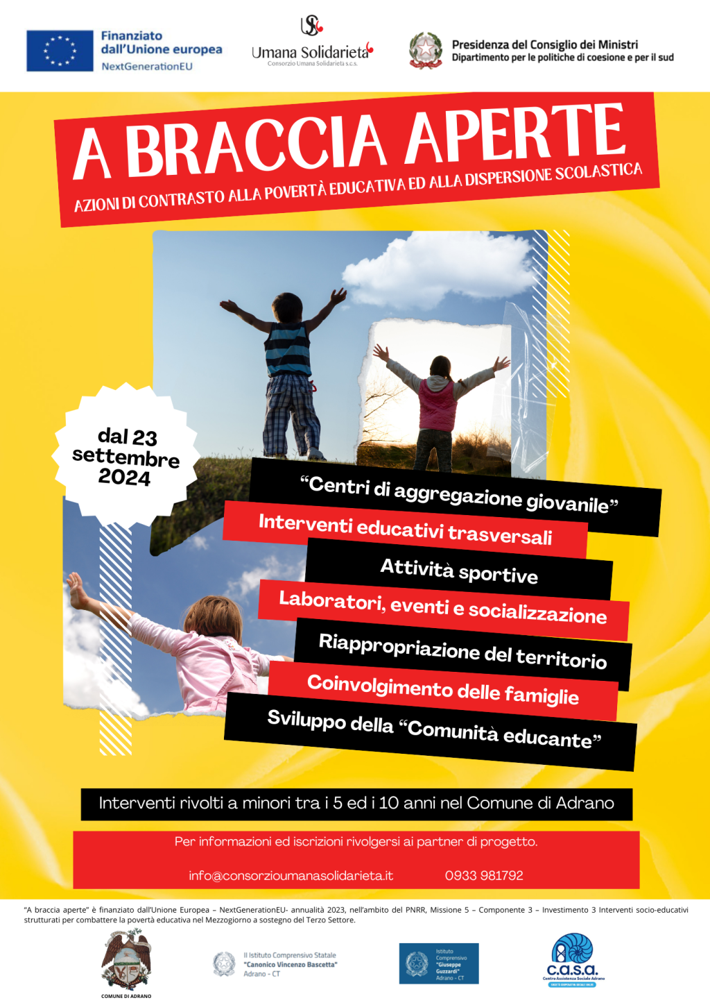 Ha ufficialmente preso il via “A Braccia Aperte”, un progetto volto a contrastare la povertà educativa e la dispersione scolastica nelle aree del Mezzogiorno, con particolare riferimento al comune di Adrano.