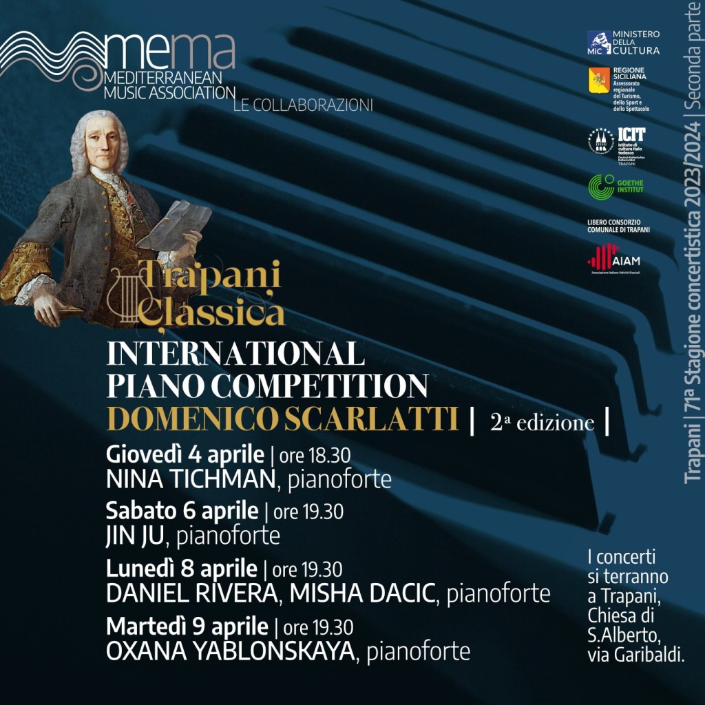 Trapani torna ad ospitare, dal 4 al 10 aprile, il Concorso Pianistico Internazionale “Domenico Scarlatti”, giunto alla sua seconda edizione co-organizzata dall’Associazione Musicale e Culturale Trapani Classica e da MEMA (Mediterranean Music Association), patrocinato dal Libero Consorzio Comunale di Trapani.