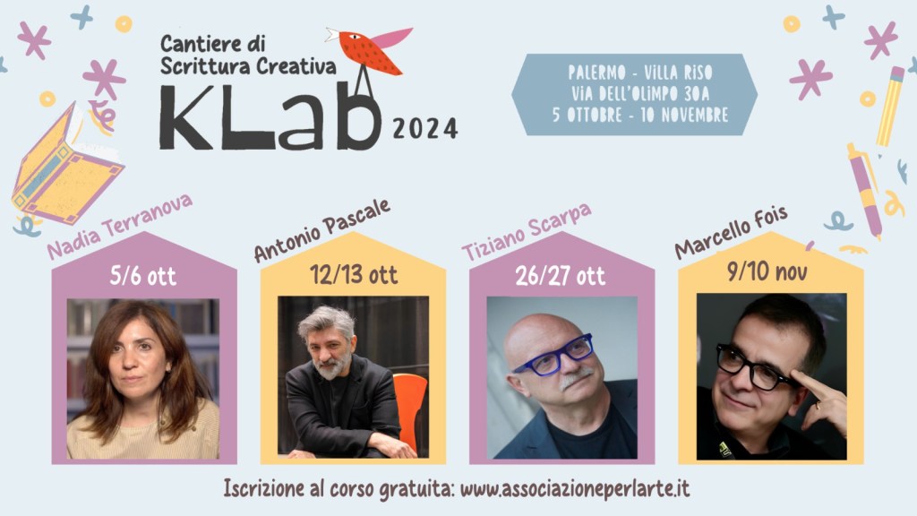 Prenderà il via il 5 ottobre a Villa Riso, a Palermo, la seconda edizione del cantiere di scrittura creativa Klab, organizzata dall’Associazione per l’Arte, che già nel mese di luglio, assieme a Linkiesta, ha dato vita al Tempio di Segesta alla seconda edizione della rassegna letteraria KFestival.
