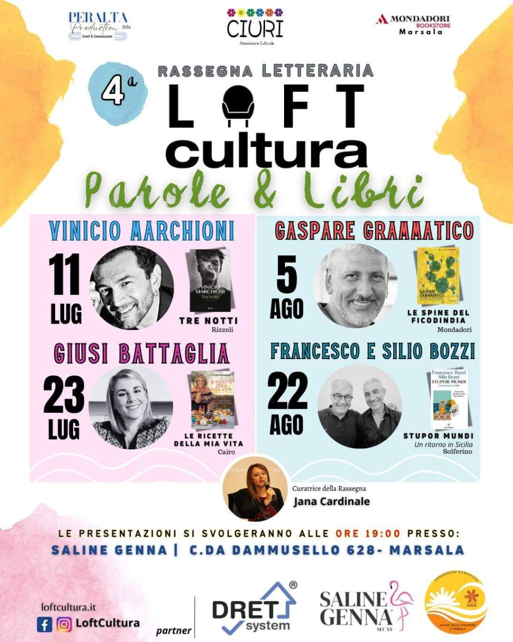 Prenderà il via giovedì 11 luglio, per concludersi il 22 agosto, la quarta edizione di “Loft Cultura – Rassegna Culturale di Parole e Libri”, organizzata dall’Associazione Culturale “Ciuri” in collaborazione con la Peralta Production e Mondadori Bookstore di Marsala, con il sostegno della Dret System, del Consorzio Turistico Laguna dello Stagnone e Marsala, e di Saline Genna. L’evento prevede quattro appuntamenti, con inizio sempre alle ore 19, alle Saline Genna, alla presenza dei rispettivi autori in dialogo con la giornalista Jana Cardinale, per momenti di condivisione e riflessioni in un’atmosfera di grande suggestione grazie al panorama naturale delle Saline.