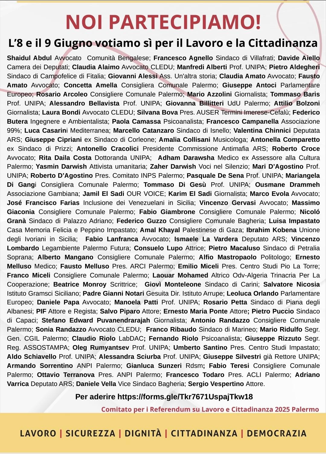 Così Palermo si prepara a sostenere i cinque referendum su lavoro e cittadinanza per i quali siamo chiamati a votare l’8 e il 9 giugno: stop ai licenziamenti illegittimi, più tutele per le lavoratrici e i lavoratori delle piccole imprese, l’obbligo del ricorso a causali per ridurre il lavoro precario, più sicurezza sul lavoro, riduzione da 10 a 5 anni per la cittadinanza italiana.