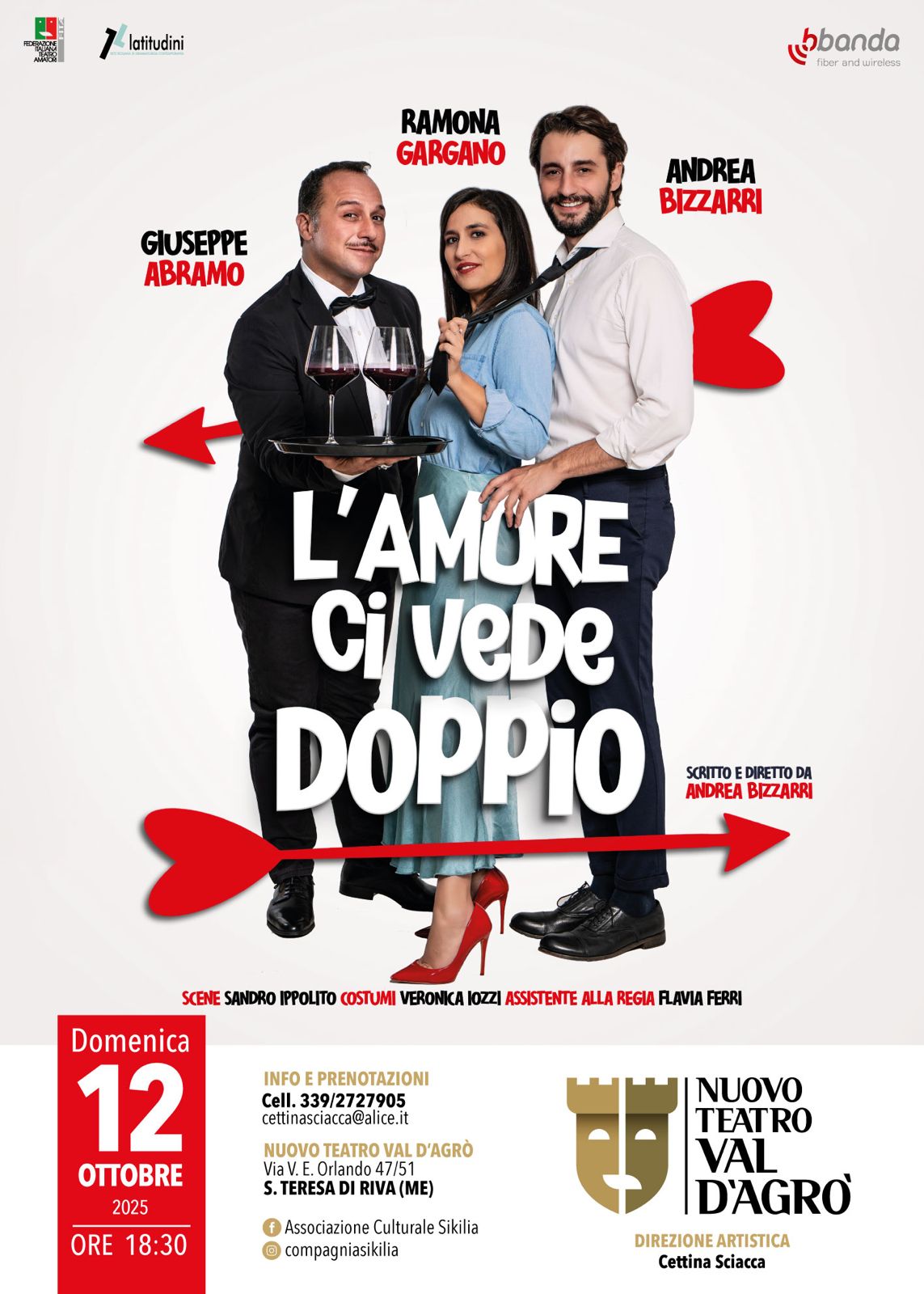 Con la commedia romantica, “L’amore ci vede doppio” di Andrea Bizzarri, con Ramona Gargano e Giuseppe Abramo, si inaugura domenica 12 ottobre a Santa Teresa Riva la nona stagione teatrale del Nuovo Teatro Val d’Agrò con la direzione artistica di Cettina Sciacca. Lo spettacolo inizia alle ore 18.30.