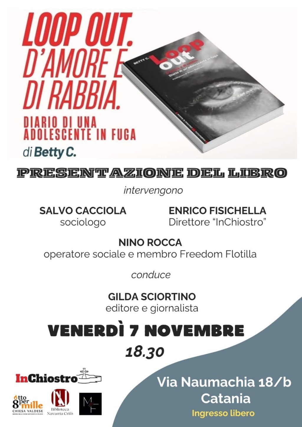 Una riflessione sul mondo degli adolescenti, il vuoto che li porta a rifugiarsi nella dipendenza da sostanze, ma non solo, la necessità di un ascolto attivo che possa farli uscire dal loop. Sarà quel che si proverà a fare alle 18.30 di venerdì 7 novembre nei locali della Biblioteca Navarria Crifò di via Naumachia 18, a Catania. Sarà, infatti, presentato “Loop out. D’amore e di rabbia. Diario di un’adolescente in fuga”, libro d’esordio di Betty C. che ci consentirà di scandagliare un mondo ai più oscuro.