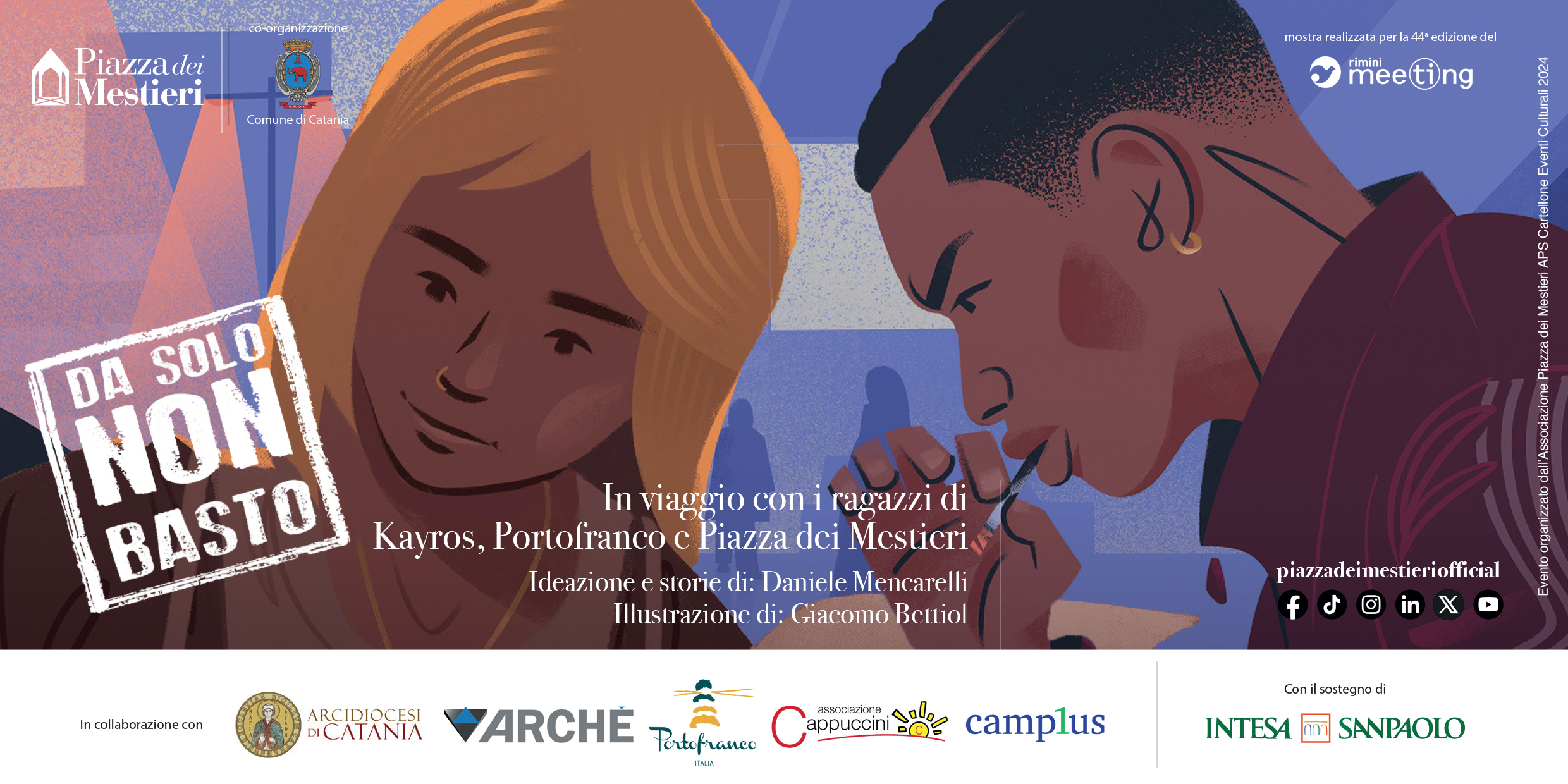 La mostra “Da solo NON basto – In viaggio con i ragazzi di Kayros, Portofranco e Piazza dei Mestieri”, che è stata realizzata ed esposta in occasione del Meeting per l’Amicizia fra i popoli di Rimini, arriva nella città etnea all’interno del cartellone eventi 2024 dell’Associazione Piazza dei Mestieri, dopo aver riscosso notevole interesse nelle altre città in cui è già stata ospitata. La tappa etnea si avvale della co-organizzazione del Comune di Catania e della collaborazione con l’Arcidiocesi di Catania, di Archè Impresa Sociale, agenzia per il lavoro ed ente di formazione che a Catania utilizza il metodo educativo della Piazza dei Mestieri nei corsi per i minori in obbligo formativo, dell’Associazione Portofranco, di Camplus Catania – Fondazione CEUR e dell’Associazione Cappuccini che da anni è attiva nel supporto scolastico, educativo e sociale ai giovani e alle famiglie del quartiere “Cappuccini” di Catania.