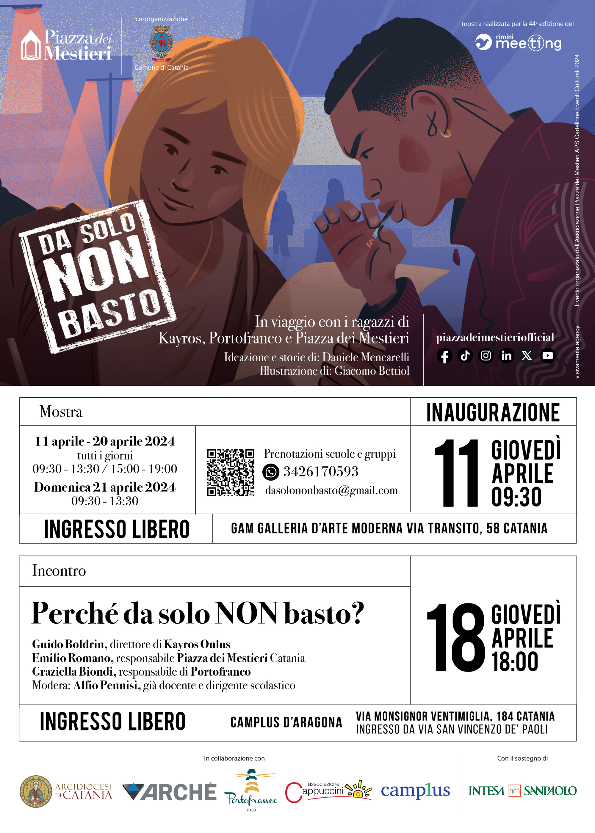 Per approfondire le tematiche della mostra il comitato organizzatore promuove un incontro dal titolo “Perché da solo NON basto?”, che si terrà giovedì 18 aprile alle ore 18:00 presso il Camplus Catania (CEUR), via Monsignor Ventimiglia 184 Catania (ingresso da via San Vincenzo de’ Paoli). Interverranno Guido Boldrin (Direttore di Kayros Onlus), Graziella Biondi (Portofranco Catania – Associazione Cappuccini), Emilio Romano (Piazza dei Mestieri Catania – Archè Impresa Sociale) e ci sarà una testimonianza di Aladin, ospite della comunità Kayros Onlus, mentre a moderare sarà Alfio Pennisi, già docente e dirigente scolastico.