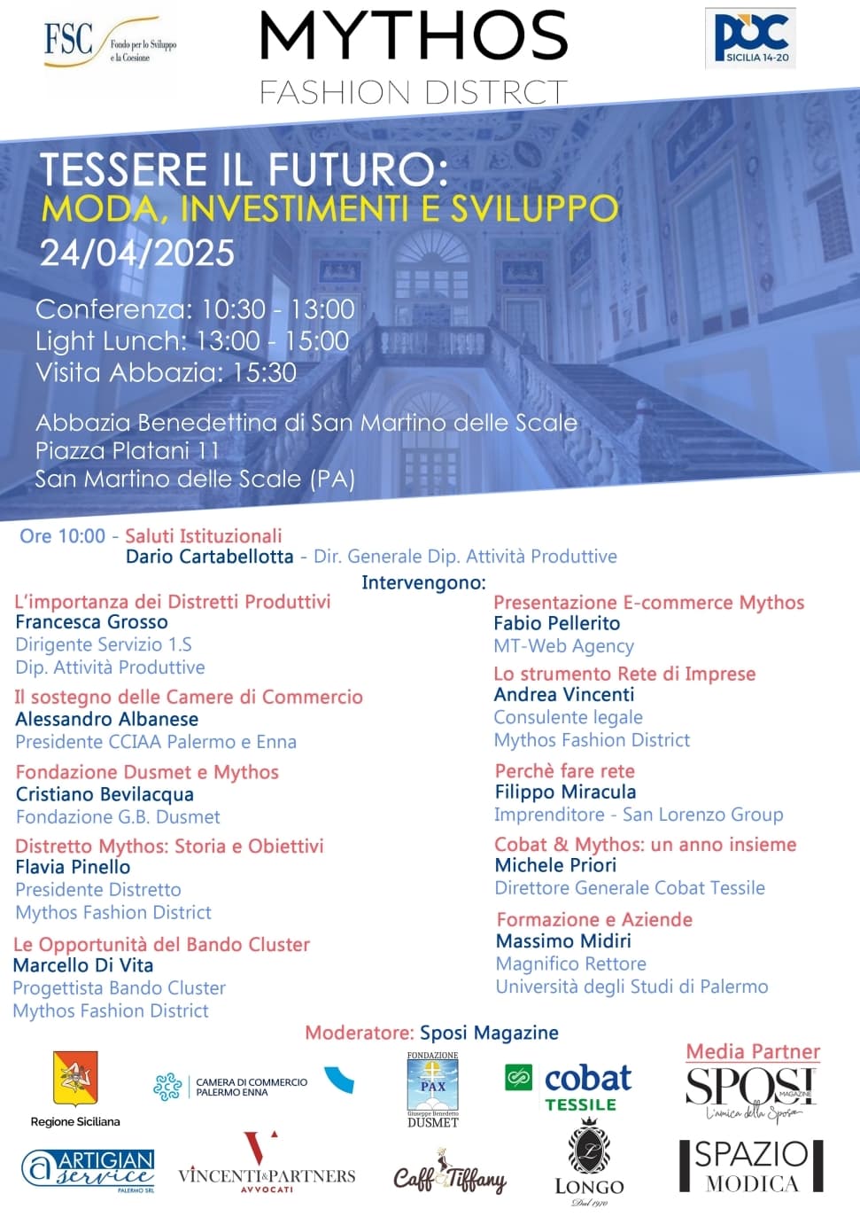 Un intreccio di visioni, imprese e bellezza: domani 24 aprile, a partire dalle ore 10.00, l’Abbazia di San Martino delle Scale, in provincia di Palermo, diventerà il cuore pulsante del fashion siciliano con la conferenza “Tessere il futuro: moda, investimenti e sviluppo”, organizzato dal Mythos Fashion District, Distretto Produttivo della Regione Siciliana del Fashion.
