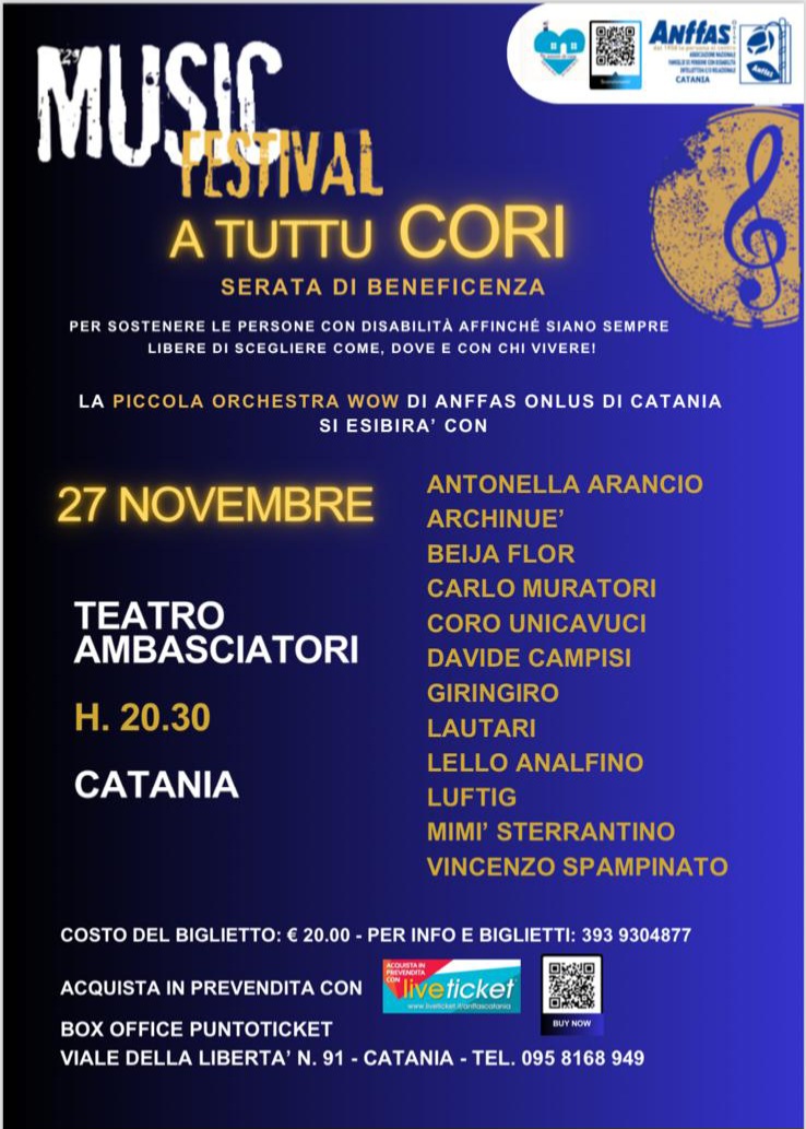 L’evento di musica e spettacolo “Music Festival a Tuttu Cori” animato gratuitamente da diversi artisti siciliani come Antonella Arancio, Archinuè, Beja Flor, Carlo Muratori, Coro Unicavuci, Davide Campisi, Giringiro, Lautari, Lello Analfino, Lufting, Mimì Starrantino Vincenzo Spampinato e il Coro Unicavuci andrà ad alimentare la sostenibilità economica del progetto “Un Amore di Casa”, già avviato dal 2017, accogliendo sia il desiderio di alcune persone con disabilità di scegliere “dove e con chi vivere” sia la preoccupazione delle famiglie sul futuro dei propri cari realizzando il primo appartamento Dopo di Noi «Durante Noi».