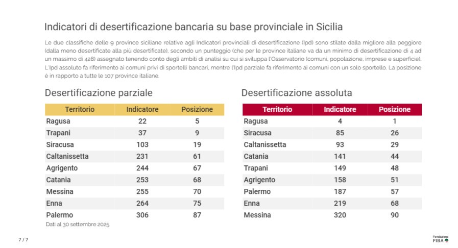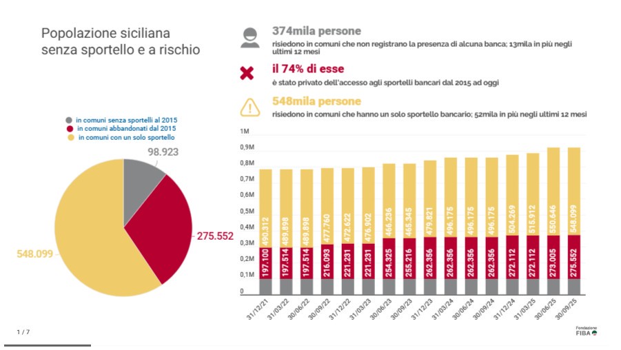 A certificare l’allarme: il report dell’Osservatorio sulla desertificazione bancaria della Fondazione Fiba di First Cisl, elaborato su dati Banca d’Italia e Istat al 30 settembre 2025. In Sicilia lo stato di difficoltà viene acuito da penalizzanti ed endemiche carenze infrastrutturali e da una popolazione residente che, peraltro, vede sempre più crescere la curva degli anziani. Nello scorrere le cifre, l’indice di desertificazione parziale vede le province di Messina, Enna, Palermo, Agrigento, Trapani e Catania occupare le posizioni medio basse della classifica. Migliore invece l’offerta finanziaria nelle province di Ragusa, Siracusa, Caltanissetta. Unicredit e Intesa Sanpaolo sono gli istituti di credito che hanno chiuso più sportelli.