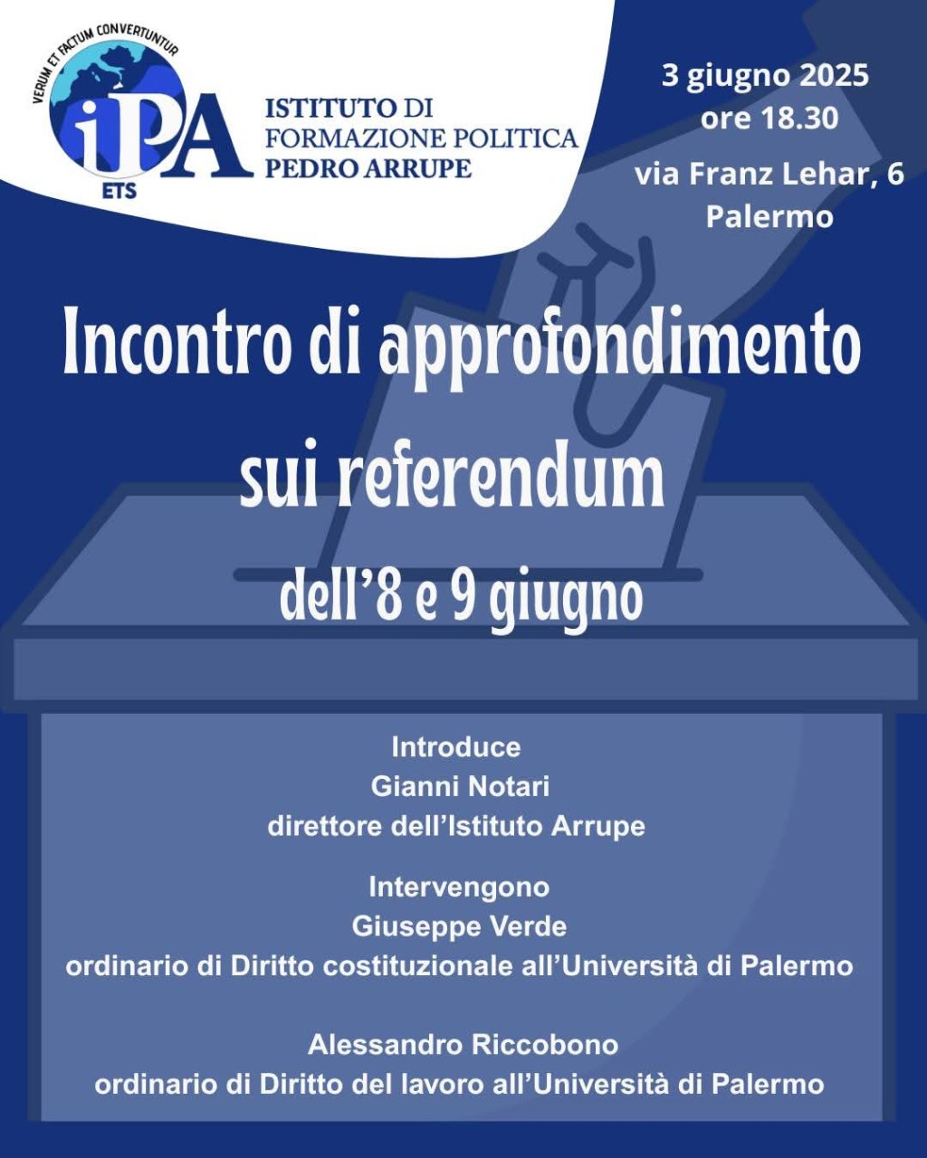 Per una scelta consapevole che ci rende persone attive che hanno a cuore il bene della nostra città e del nostro Paese. A partire da questo pensiero, in vista dei referendum, in programma per i prossimi 8 e 9 giugno, l’Istituto di Formazione Politica Pedro Arrupe organizza, il prossimo 3 giugno alle ore 18.30 presso la sua sede, un incontro di approfondimento finalizzato a offrire strumenti utili alla comprensione dei quesiti referendari, delle loro implicazioni e delle possibili conseguenze sul piano politico, sociale e giuridico.