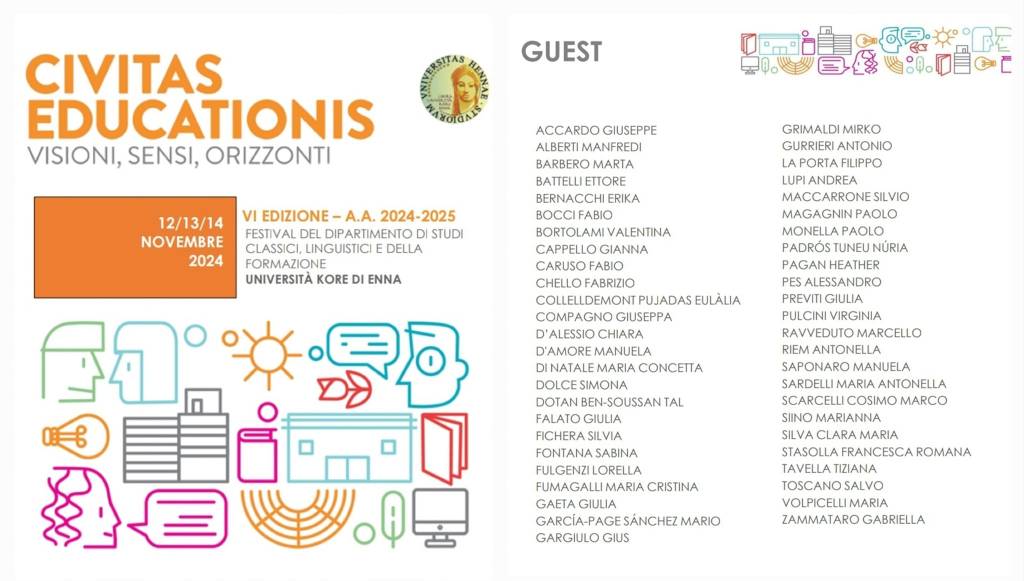 Dal 12 al 14 novembre 2024, presso l’Università degli Studi “Kore” di Enna, si terrà la sesta edizione del festival “Civitas educationis. Visioni, sensi, orizzonti”, organizzato dal Dipartimento di Studi Classici, Linguistici e della Formazione. Ideato nel 2019 dalla professoressa Marinella Muscarà, direttrice del Dipartimento, il festival è oggi un evento imperdibile che segna l’apertura dell’anno accademico e, quest’anno, festeggia anche i vent’anni di attività dell’Ateneo ennese.