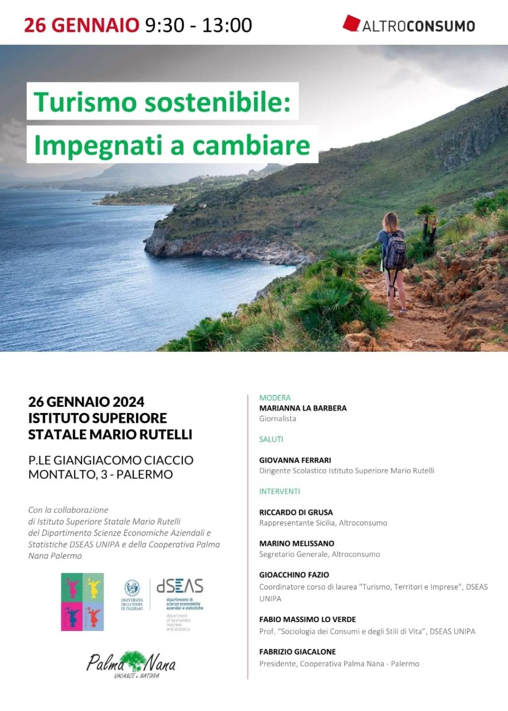 “Turismo sostenibile: impegnati a cambiare” è il titolo della conferenza a cura di Altroconsumo in programma a Palermo venerdì 26 gennaio all’Istituto Superiore Statale “Mario Rutelli”, in piazzale Giangiacomo Ciaccio Montalto 3.