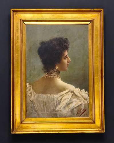 Il dipinto, realizzato nel 1895 firmato “G. Rapp”, la ritrae di spalle, a mezzo busto, in una posa sorprendentemente moderna per l’epoca in cui ci trovavamo. Nel ritratto lo sguardo non è rivolto allo spettatore, ma si sottrae. E’ una presenza elegante, distante. E’ ritratta in abito bianco, con un collier de chien (termine francese che indica letteralmente “collare per cani”). Nel contesto della gioielleria indica un tipo di collana girocollo molto aderente. In questo caso realizzato da Cartier in platino e perle, con gli orecchini di perle abbinati. L’insieme rappresenta non solo il lusso, ma anche il suo status e la costruzione di un’immagine consapevole del suo ruolo pubblico.