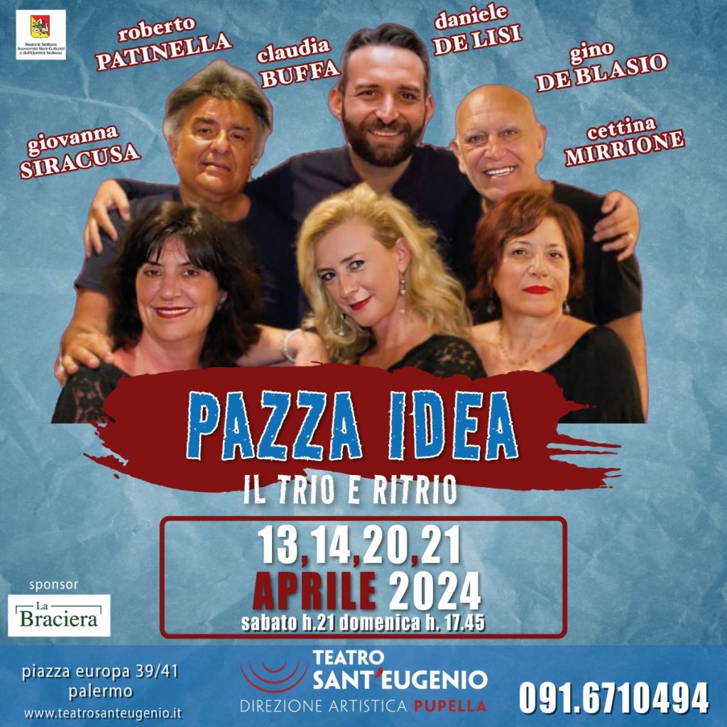 Ancora due week end di risate sono in programma al teatro Sant’Eugenio – Direzione Artistica Pupella di piazza Europa 39/41 a Palermo, in scena sabato 13 e domenica 14 aprile, e poi, sabato 20 e domenica 21 aprile, la commedia “Pazza idea” con il divertentissimo Trio e Ritrio che è composto da: Giovanna Siracusa, Roberto Patinella, Claudia Buffa, Daniele De Lisi, Gino De Blasio, e Cettina Mirrione. Lo spettacolo andrà in scena nei giorni di sabato alle ore 21, mentre la domenica sarà alle 17.45, e sostituirà per questi due week end “Più o meno pausa” con Daniela Pupella che firma anche il testo insieme a Francesca Picciurro e Marco Pomar, che era in Cartellone per questa stagione, e che invece sarà messo in scena nella prossima.
