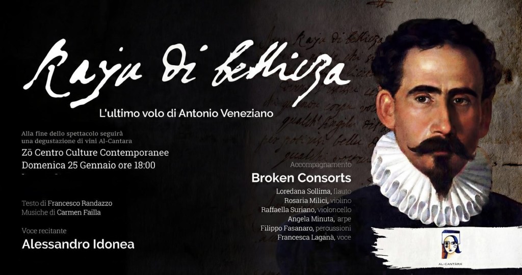 Secondo appuntamento il 25 Gennaio alle 18,00 da Zò Centro Culture Contemporanee con lo spettacolo “Raju di Bellicza” L’ultimo volo di Antonio Veneziano. Lo spettacolo presenta un viaggio nelle suggestioni sonore del mediterraneo e della Sicilia attraverso le musiche composte da Carmen Failla interpretate dalle Broken Consorts. I testi, opera di Francesco Randazzo sulla vita, le vicissitudini e la poesia del grande poeta siciliano del cinquecento Antonio Veneziano saranno interpretati da Alessandro Idonea.