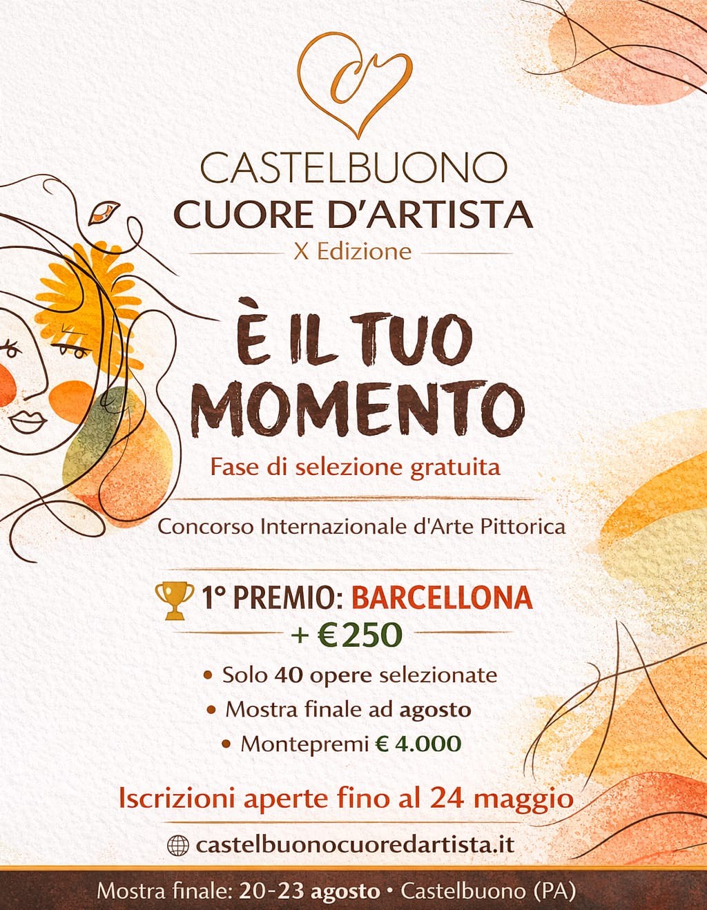 Sono ufficialmente aperte le iscrizioni alla decima edizione del concorso internazionale di arte pittorica “Castelbuono Cuore d’Artista”, un’iniziativa che negli anni ha saputo affermarsi come punto di riferimento per artisti provenienti da tutta Europa e non solo, con centinaia di candidature ad ogni edizione.