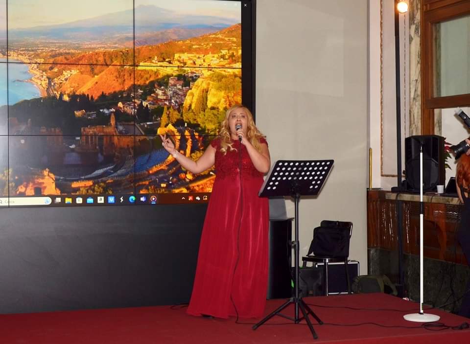 La calda voce della cantante catanese Angela Di Mauro inonda di luce e di calore l’evento “Fantasy Painting of Christmas”.