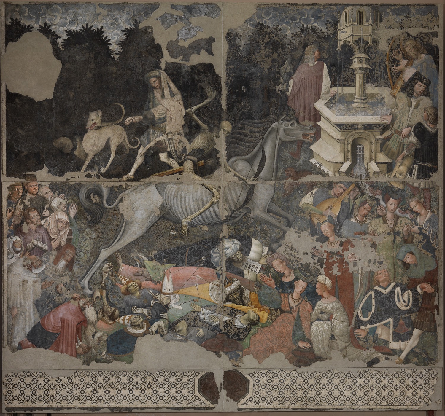 Il Trionfo della Morte rappresenta l’Europa delle corti e delle èlite ma rappresenta anche la società borghese e popolare, organizzata in categorie rigide. Il tempo del Trionfo della Morte è quello degli anni appena precedenti la metà del Quattrocento, epoca in cui la Sicilia era al centro delle rotte mediterranee con capitale la Napoli di Alfonso d’Aragona alla cui volontà risale la fondazione dell’istituto ospedaliero a Palermo, originaria sede del grande affresco. Questo incontro di culture circoscrive ulteriormente il campo alla pittura fra Napoli e la Sicilia al tempo di Alfonso d’Aragona, cultore delle arti.