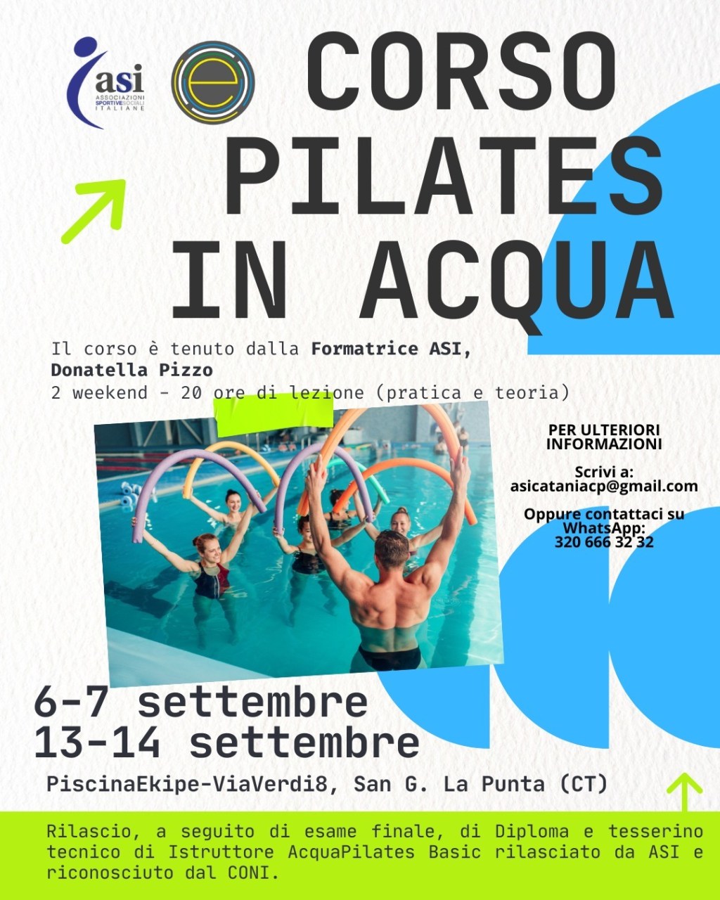 Per due fine settimana consecutivi, appuntamento con il corso di formazione per diventare istruttore di Pilates in acqua, organizzato dall’ASI, comitato provinciale di Catania presieduto da Angelo Musmeci. L’ente di promozione sportiva riconosciuta dal Coni, ha organizzato infatti per sabato 6 e domenica 7 settembre e per sabato 13 e domenica 14 settembre nella Piscina Ekipe di via Verdi, 8 a San Giovanni la Punta (Catania) le lezioni rivolte a istruttori fitness e acqua fitness, insegnanti di Pilates, operatori del benessere dello sport e laureati e studenti in scienze motorie.