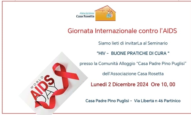 In relazione alla giornata internzionale contro l’AIDS l’Associazione Casa Famiglia Rosetta di Caltanissetta, organizza presso la sede decentrata di Partinico, dove ha sede la Comunità Alloggio per Persone Affette da HIV/ AIDS ” Casa Padre Pino Puglisi” , un seminario dal titolo AIDS/ HIV – Buone Pratiche di Cura- Aprirà i lavori il Dott. Giuseppe Marascia- Referente Associazione Casa Rosetta, seguiranno i Saluti IstituzionaliDott.ssa Dorotea Speciale Vice Sindaco-Assessore Servizi Sociali e Welfare, Pari Opportunità e Attività Culturali e Rapporti con Associazioni Culturali. Interverranno Dr. Tullio Prestileo Dirigente Medico UOC di Malattie Infettive ARNAS Ospedale Civico-Benfratelli Palermo;Dr. Giampaolo Spinnato Direttore Unità Operativa Complessa Dipendenze Patologiche di Palermo,Dr.ssa Francesca Picone Direttrice Unità Operativa Complessa Modulo 9 Partinico/ Carini, Dott.ssa Angela Di Grazio Assistente Sociale e Responsabile della Comunità Alloggio “Casa Padre Pino Puglisi” – Partinico – dell’Associazione Casa Rosetta.