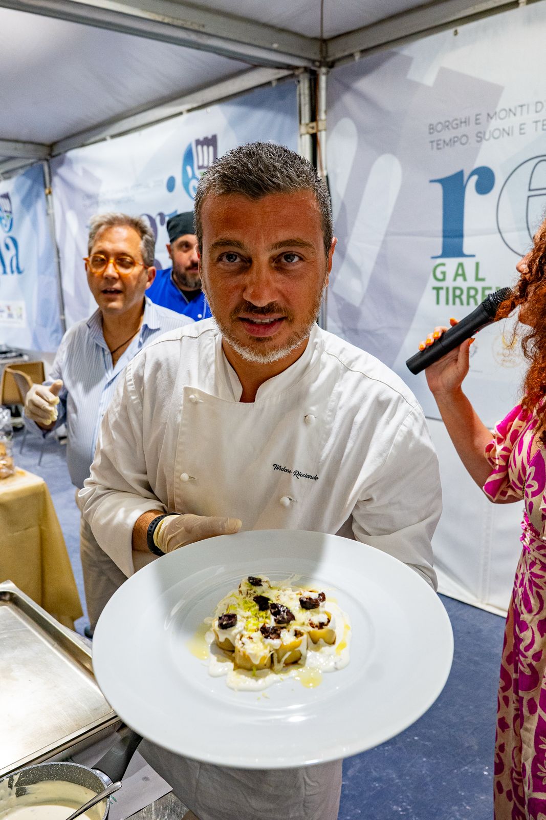 Per quel che concerne la sosta ad Oliveri dal 14 al 16 agosto, località balneare e turistica per eccellenza, i fondi del Gal Tirrenico hanno riattivato la magica Area del Rais fronte mare, carica di storia dai tempi della Tonnara e della Mattanza, che può essere volano per i vacanzieri, peraltro vicina ai cimeli degli antichi palischermi. La location all’interno dell’ExpoOliveri è stata sicuramente un successo con la presenza di autorevoli ospiti per la tavola rotonda e con il Cooking Show che ha omaggiato il Tonno ma con un tocco di internazionalità: “Tacos Mediterraneo con Tonno Tombarello, Macedonia di Ortaggi e Maionese al Pomodoro”. Dal litorale alla montagna, il passo è stato breve il 17 agosto, raggiungendo il regno della Provola Basicotana illuminando la piazza della Chiesa Matrice di San Francesco, con un Villaggio Enogastronomico sempre più ricco con tutti i prodotti delle tredici comunità e con il Cooking Show proposto dalla lady chef Lorenza Campisi, con l’idea culinaria dello chef Ricciardo ossia la cheesecake alla Provola di Basicò, salsa di more e mirtilli selvatici con una base di frollini alle nocciole locali e scorza di limone. Il sindaco Filippo Gullo è stato lieto di ricevere il sostegno economico del Gal Tirrenico per la riqualificazione dell’area del Palazzo Baronale De Maria che è adibita alla collocazione del Museo Etnoantropologico e il consolidamento del giardino di pertinenza dello stesso palazzo per evitare movimenti franosi. Si arriva a Falcone dal sindaco Carmelo Paratore, il 19 e 20 agosto, con un nuovo talk show e un nuovo piatto, un risotto a base di acciughe del territorio, presentato nuovamente dallo chef Ricciardo e con nuovi spettacoli tra cui il cabaret di Mariuccia e una piazza gremita. Da Falcone ci si sposta a Terme Vigliatore, in piazza Municipio il 22 e 23 agosto, con una buona parte dell’Amministrazione comunale (il vicesindaco Domenico Genovese ha fatto le veci del sindaco Cipriano) ma anche con produttori di olio e vino, florovivaisti e ristoratori di zona e naturalmente con una tipicità che ha fatto gola a tanti avventori, pronti ad assistere sia all’esibizione dello chef sia al cabaret sia allo spettacolo musicale del giovanissimo Francesco Maugeri e del gruppo Atmosfera Blu. Con la Tappa Esterna a Lipari, si completa un cerchio a Palazzo Vescovile con la XX Edizione di “Eolie in classico” e una quattro giorni (dal 26 al 30 agosto) di spettacoli di spessore e con la performance esclusiva del celebre chef Lucio Bernardi, diventato nel frattempo private chef, oltre ad essere cotitolare dell’internazionale “Ristorante Da Filippino”. Il maestro Bernardi ci ha tenuto a valorizzare le eccellenze del territorio espresse dal Gal Tirrenico nella maratona “Borghi e Monti d’aMare” con il piatto della prima giornata che ha mandato in visibilio tutti i convenuti, invitati a numero chiuso. Ma nelle date successive Bernardi si è sbizzarrito anche con il Pane biscottato caliato (appena inumidito), originario di Castroreale e ai chiodi di garofano, con Provola di Basicò, scarola e vasetti di pomodoro capuliato e il finocchietto selvatico di Barcellona Pozzo di Gotto. Approdando a Rodì Milici il 27 agosto, la leccornia garantita è stata un primo piatto ai Grani Antichi Siciliani, simbolo di autenticità, biodiversità, sostenibilità e passione: un formato speciale, la calamarata, con grani Russello, Perciasacchi e Tumminia, una sfoglia nobile con un ripieno vibrante fatto da pomodori locali maturati al sole, melanzane spadellate, olive nere della zona, sapide e carnose e formaggio primosale di zona; il tutto condito con olio Evo e ricotta infornata di Rodì Milici. Distribuito anche il tradizionale dolce Riso Nero dall’Associazione “Anima” (con riso e mandorle tostate). Qui, il sindaco Eugenio Aliberti si è cimentato nel suo hobby preferito: la cucina, affiancando lo chef Ricciardo dopo aver dibattuto sugli argomenti del territorio a lui cari (dal Carnevale Storico Estivo ai giovani che hanno bisogno di nuove start up d’impresa in queste aree). A Mazzarrà Sant’Andrea con il “titolare di Municipio” Carmelo Pietrafitta, dal 28 al 30 agosto, la festa è stata consacrata, nonostante il maltempo di giorno 30 agosto, proponendo la rock band Le Vibrazioni a Largo Manzoni con il frontman Francesco Sarcina in forma scoppiettante, nell’atmosfera saporita del Festival degli Agrumi. In questa cittadina, le straordinarie doti del florovivaismo sono sottolineate dalla presenza di oltre cento realtà produttive. E poi un luminare della medicina, dai natali mazzaresi, è il professore Davide D’Amico che è stato il primo chirurgo, a fine novembre 1990, ad eseguire il primo trapianto di fegato su una donna calabrese, accreditandosi come un’eccellenza con un bilancio di oltre 500 trapianti epatobiliari. Anche in questo caso, il Primo Cittadino si è prestato ai fornelli, anzi si è concesso di guarnire il pre – dessert con sablé croccante al pomodoro, arancia e rosmarino, yogurt naturale al verdello e marmellata di arancia e Kumquat. Ma lo chef Ricciardo ha voluto impreziosire il Cooking Show con un secondo piatto di carne (maialino marinato) agli agrumi nella bella Piazza Umberto I°. A coordinare gli angoli di dibattito del tour e di Cooking show è stata la giornalista Marcella Ruggeri.