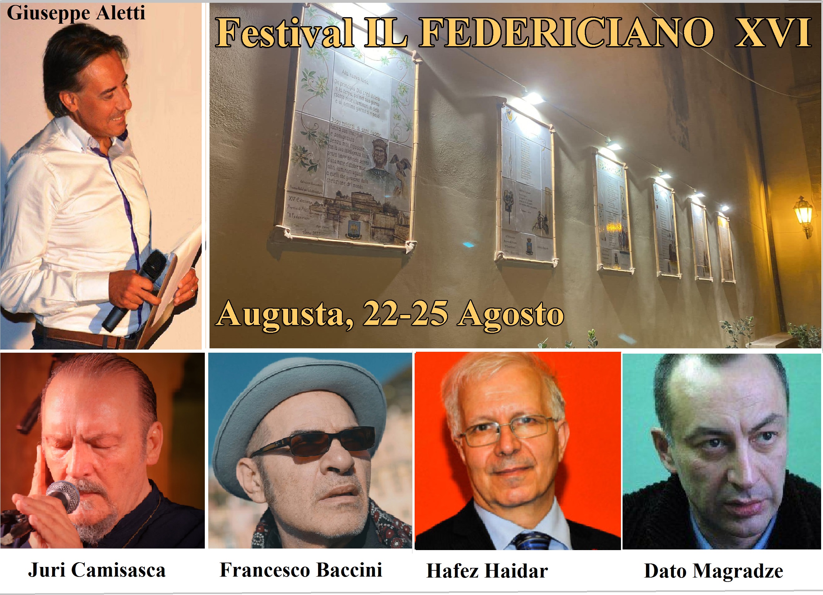 Dopo aver presentato tutti i testi in maiolica per il 2024, dell’antologia poetica a cielo aperto racchiusa nelle strade di Augusta, si darà il via alla cerimonia di premiazione dedicata ai poeti. Un evento imponente, già sperimentato nell’edizione 2023, che prevede la lettura in contemporanea da parte dei poeti presenti, provenienti da ogni parte d’Italia e anche dall’estero, in ben tre piazze del centro storico: Piazza Duomo, Piazza Mercato e Piazza Castello, alla presenza del Premio Nobel Prof. Hafez Haidar, del poeta georgiano Dato Magradze e di Juri Camisasca. Anche l’intensa giornata del 24 agosto si concluderà in convivialità con la Cena di Gala, alla presenza del Maestro Aletti, del Prof. Haidar e dello staff.