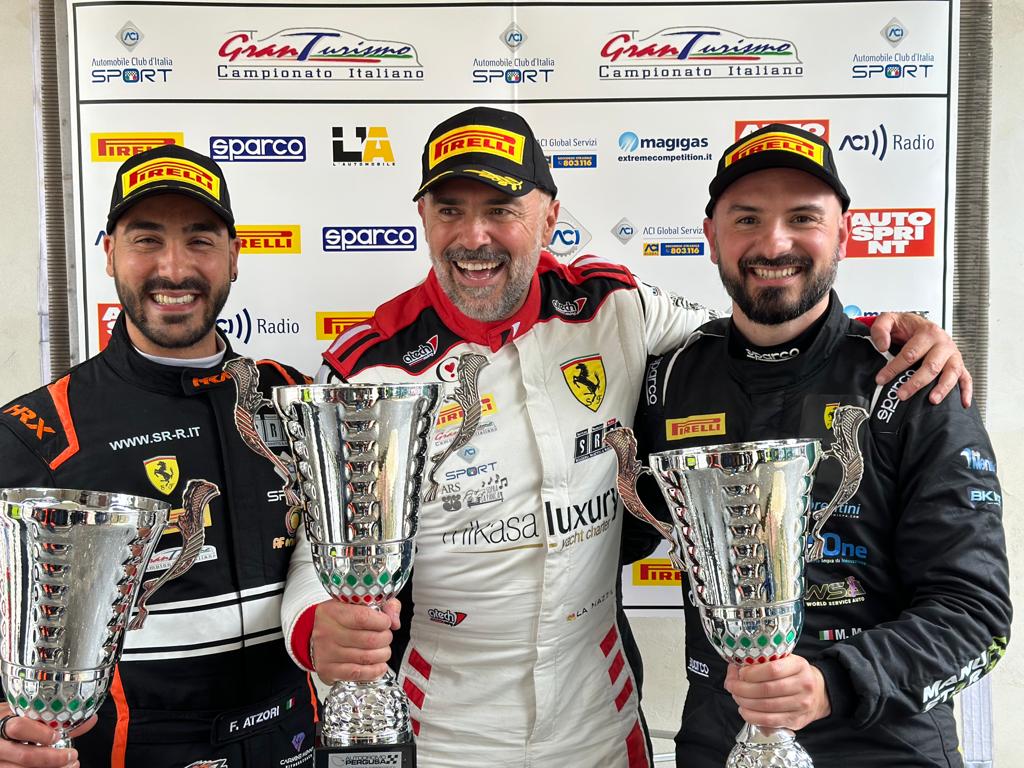 Anche la gara è stata caratterizzata inizialmente dalla pioggia battente, tanto da essere sospesa per circa un’ora e mezza. Poi, finalmente, le condizioni meteo sono migliorate e, con i primi giri in regime di safety car, è stato dato il via. Atzori ha confermato le sue qualità nel primo stint, aumentando il distacco rispetto ai rivali della stessa categoria. Al primo cambio pilota, è stato La Mazza a guidare la numero 251, poi è toccato a Manuel Menichini. Entrambi sono stati bravissimi nel mantenere e accrescere la differenza rispetto ai contendenti (nella classe di appartenenza gli inseguitori sono stati distanziati di un giro). E così il Campionato italiano GT si è aperto con una vittoria per il pilota catanese, soddisfattissimo dopo la premiazione: “Nonostante le condizioni climatiche, abbiamo disputato una gara perfetta con un costante supporto da parte del team. Atzori è stato bravissimo durante le qualifiche e nelle due ore di gara non abbiamo sbagliato niente tenendo dietro anche vetture di categorie superiori. Un ottimo inizio e adesso puntiamo alla prossima gara del Mugello. È stato per me un bel week end – ha spiegato La Mazza – caratterizzato anche dall’incontro didattico che ho tenuto con i ragazzi che vogliono avvicinarsi al motorsport. Un’esperienza bellissima per cui ringrazio l’Associazione culturale “Sopra la Panca”, l’Ars – Assemblea Regionale Siciliana – che ha patrocinato l’evento, oltre al presidente dell’autodromo di Pergusa”.