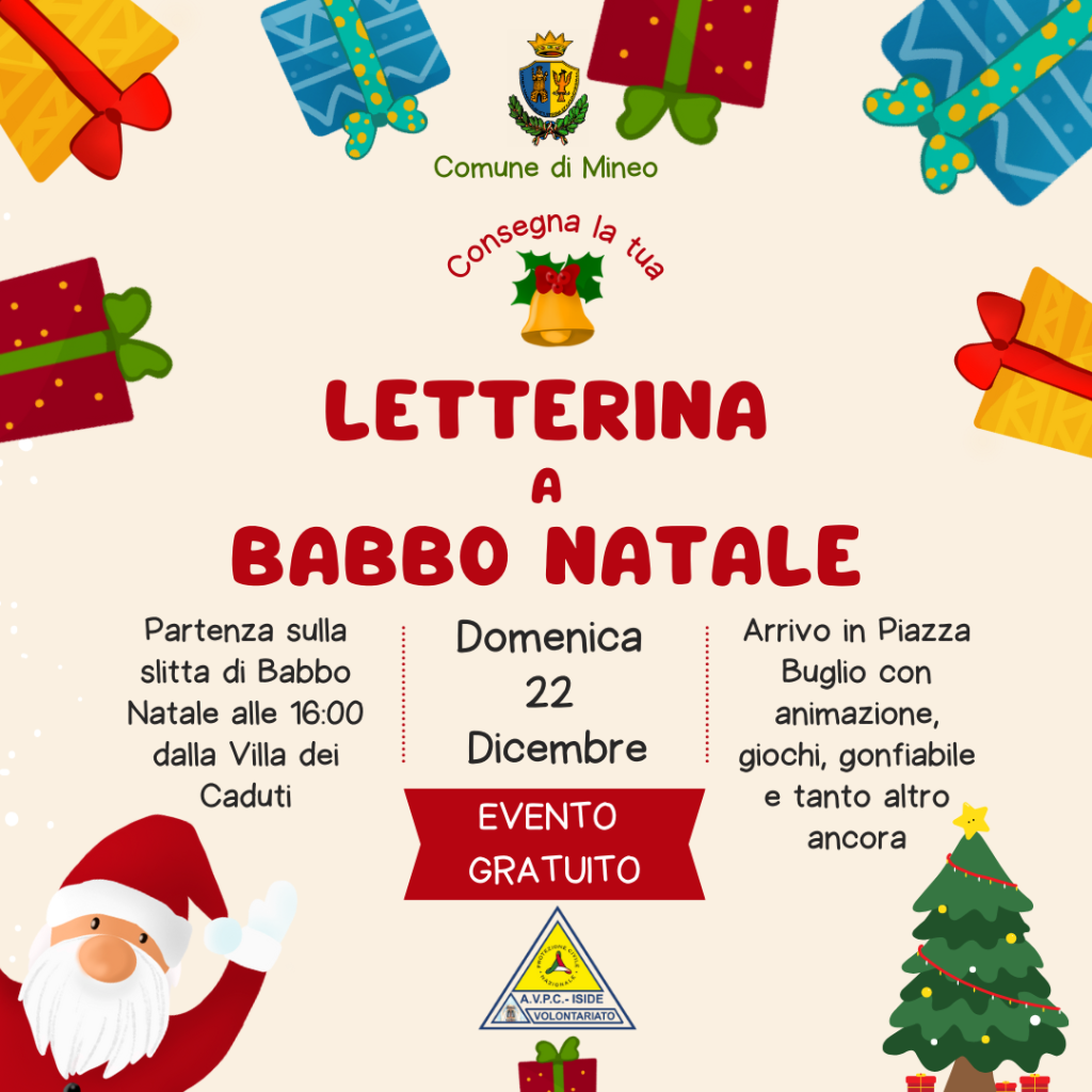 Una giornata dedicata alle famiglie: Si dice che Babbo Natale sia già arrivato a Mineo… Domenica pomeriggio (22 dicembre), i bambini e le bambine insieme ai propri genitori potranno scrivere e consegnare la propria letterina a Babbo Natale in persona!
