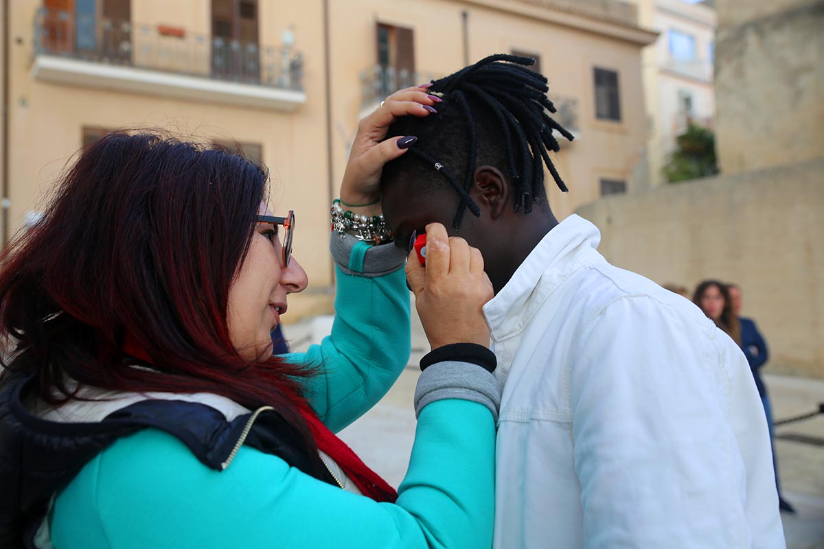Il programma si è articolato in tre fasi distinte e complementari. La prima ha previsto un momento formativo dedicato alla comprensione del significato della Giornata internazionale contro la violenza sulle donne, istituita dall’ONU nel 1999. Durante questi incontri, i mediatori culturali e gli operatori hanno stimolato discussioni approfondite sul tema del rispetto e della dignità della persona, creando un ponte tra culture diverse. Nella seconda fase, i partecipanti hanno visitato le panchine rosse installate nei centri storici di Salemi e Vita. Questi simboli della lotta contro il femminicidio sono diventati luoghi di riflessione e condivisione. I beneficiari hanno manifestato il loro impegno attraverso gesti simbolici significativi: un segno rosso dipinto sotto l’occhio e la scritta “NO” sul palmo della mano con un rossetto, segni di una chiara opposizione a ogni forma di violenza. Il momento culminante dell’iniziativa è stato raggiunto nella serata di sabato 23, quando i centri di accoglienza di via Sturzo a Salemi e di via Valle del Belice a Vita sono stati illuminati da fari rossi per sensibilizzare la cittadinanza contro la violenza sulle donne. I centri sono rimangono illuminati fino al 25 novembre. Questo gesto simbolico ha voluto ricordare in particolare Marisa Leo, giovane donna del vino di Salemi tragicamente uccisa dal suo ex compagno, e con lei tutte le vittime di femminicidio. L’illuminazione esterna col faretto rosso delle strutture di accoglienza di Badia Grande di Salemi e Vita ha creato un momento di forte impatto emotivo, sottolineando l’importanza della memoria e dell’impegno collettivo contro la violenza di genere.