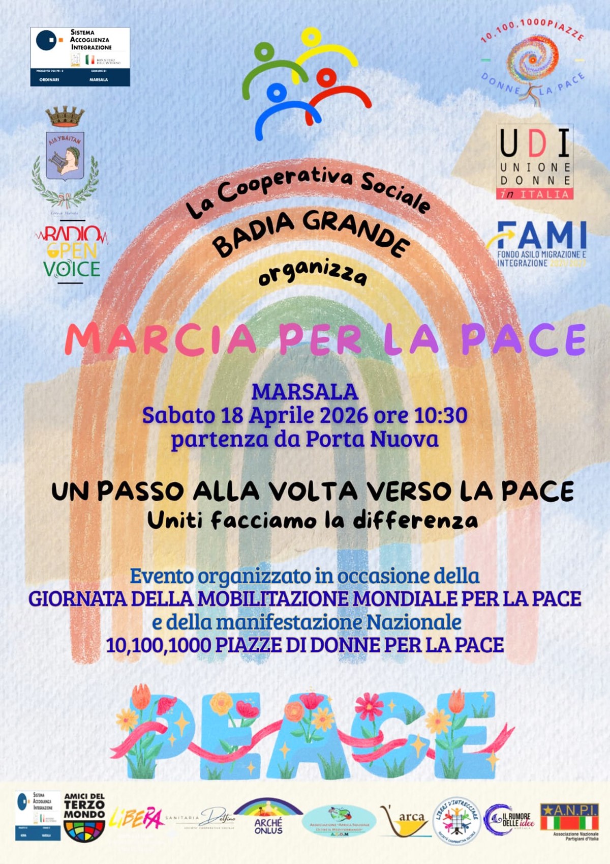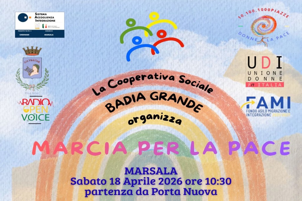 Marsala torna a mettersi in cammino per dire no alle guerre e sì ai diritti, con una marcia che unisce storie, ricordo, ferite ancora aperte e speranze. Raduno dei partecipanti sabato 18 aprile alle ore 10.00 a Piazza della Vittoria, da dove partirà alle 10.30 il corteo “Un passo alla volta verso la Pace: uniti facciamo la differenza”, promosso dalla Cooperativa Sociale Badia Grande con il patrocinio gratuito del Comune. Un fiume di persone di diverse nazionalità attraverserà il centro storico fino a Piazza della Repubblica, portando con sé il peso delle esperienze vissute e la speranza di un gesto che vuole aprire spiragli di futuro.