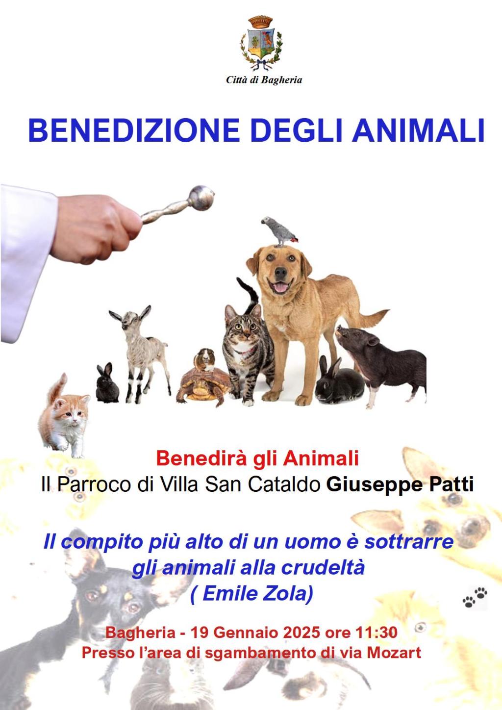 Bagheria, 9 gennaio 2025 • Domenica 19 alle ore 11:30, presso l’area di sgambamento di via Mozart, si terrà la tradizionale benedizione degli animali e dei loro accompagnatori. Un momento di festa e di spiritualità dedicato ai nostri amici a quattro zampe e a tutti coloro che li amano. Ad impartire la benedizione sarà padre Giuseppe Patti, in un rito che affonda le sue radici nella tradizione contadina e che celebra il legame speciale tra uomo e animale.