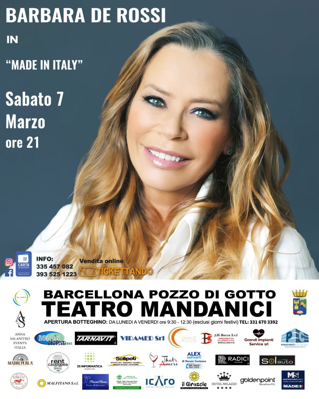 Sabato 7 marzo 2026 alle ore 21.00 il Teatro Mandanici di Barcellona Pozzo di Gotto (ME) ospita “Made in Italy”, spettacolo interpretato da Barbara De Rossi, scritto da David Norisco, con Orchestra filarmonica, Video Art di Emanuele Rossi e regia di Francesco Branchetti