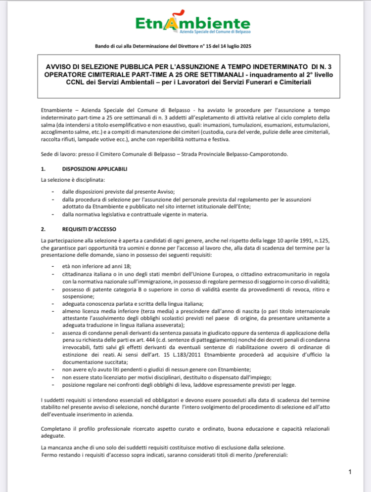 Il consigliere comunale di Belpasso, capogruppo Prima l’Italia Stefano Toscano, annuncia con soddisfazione l’annullamento del bando di concorso per tre operatori cimiteriali pubblicato dalla partecipata **Etnambiente**, a seguito delle gravi criticità sollevate dall’opposizione.