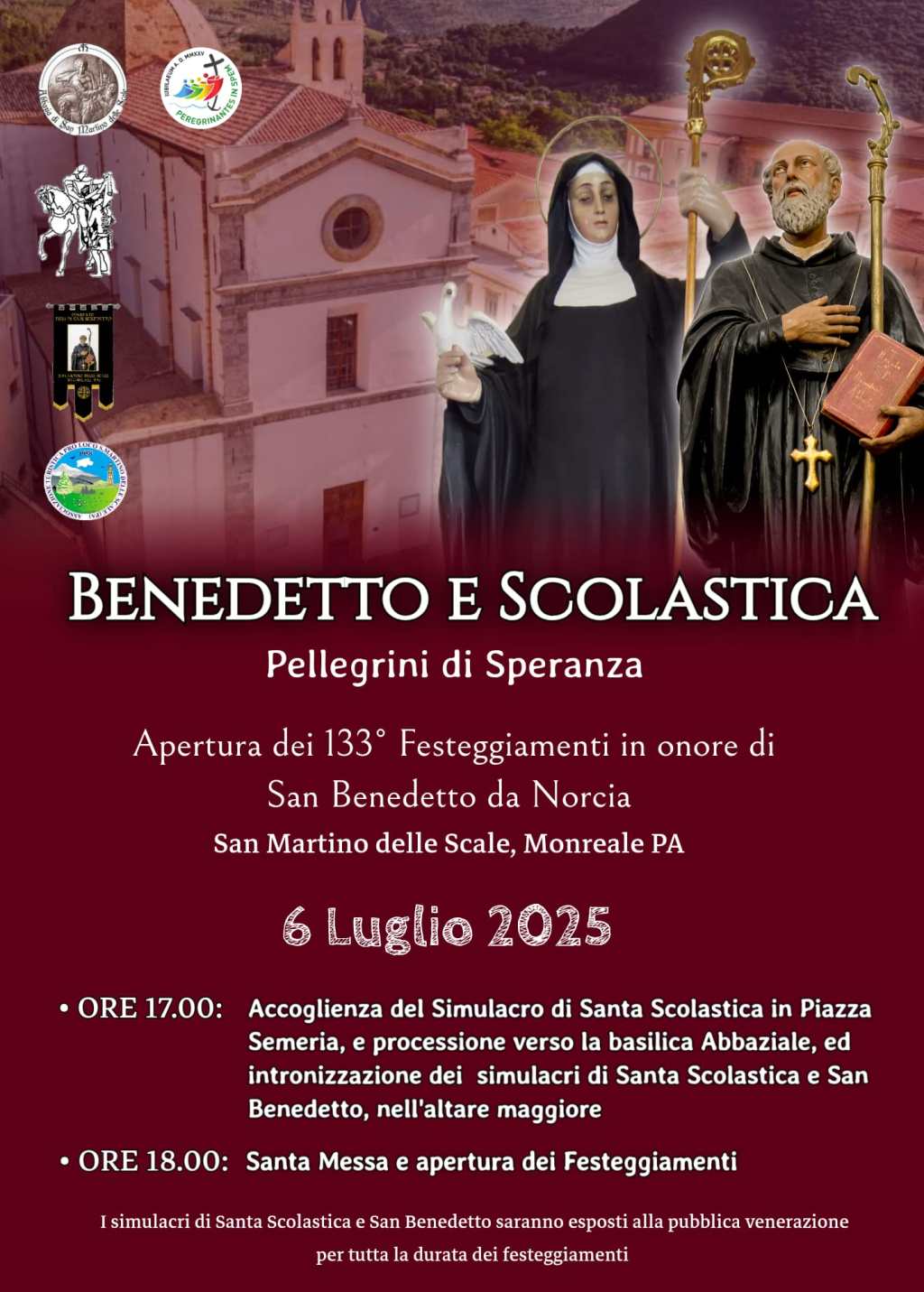 Sarà un avvio carico di emozione, simbolismo e intensa spiritualità quello dei 133° Festeggiamenti in onore di San Benedetto da Norcia, che si apriranno con un evento straordinario dal titolo: “Benedetto e Scolastica, pellegrini di speranza”. Un’iniziativa che, in questo Anno Giubilare, vuole offrire un segno potente di riconciliazione, fraternità e luce, riportando al centro l’insegnamento senza tempo del Santo Patriarca del monachesimo occidentale e della sua sorella gemella, Santa Scolastica. L’iniziativa, voluta e organizzata dal Comitato “I Figli di San Benedetto” dalla Proloco di San Martino della Scale e dalla comunità monastica, vedrà l’arrivo del simulacro di Santa Scolastica (Patrona di Piano Geli) a Piazza Semeria, sabato 6 luglio 2025 alle ore 17:00, in un momento di profonda devozione e partecipazione popolare.