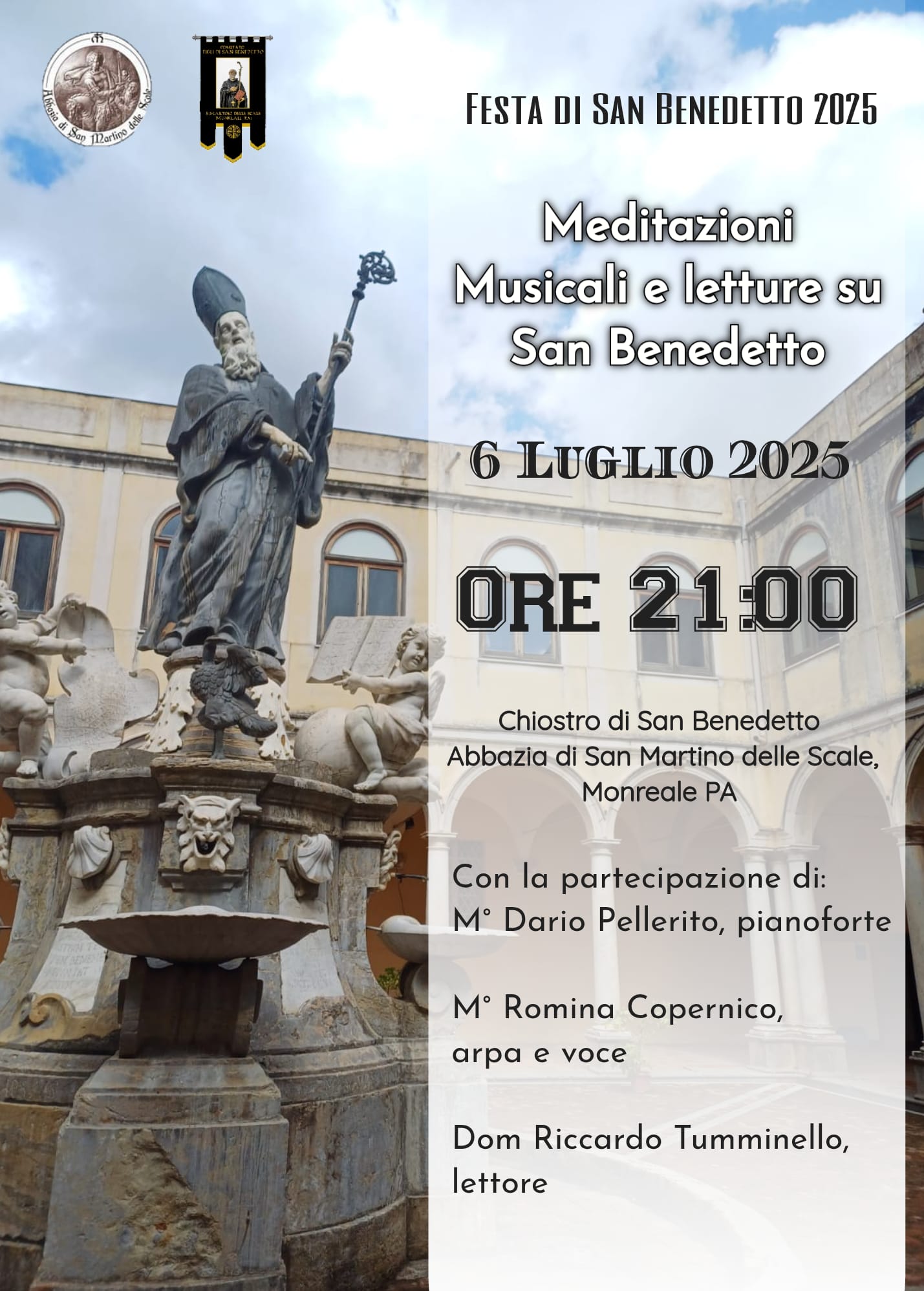 La serata proseguirà alle ore 21:00 con un momento di profonda meditazione artistica e spirituale: le “Meditazioni Musicali su San Benedetto”, un concerto-orazione che unirà musica, parola e contemplazione, guidando i presenti in un viaggio interiore alla scoperta del messaggio benedettino.