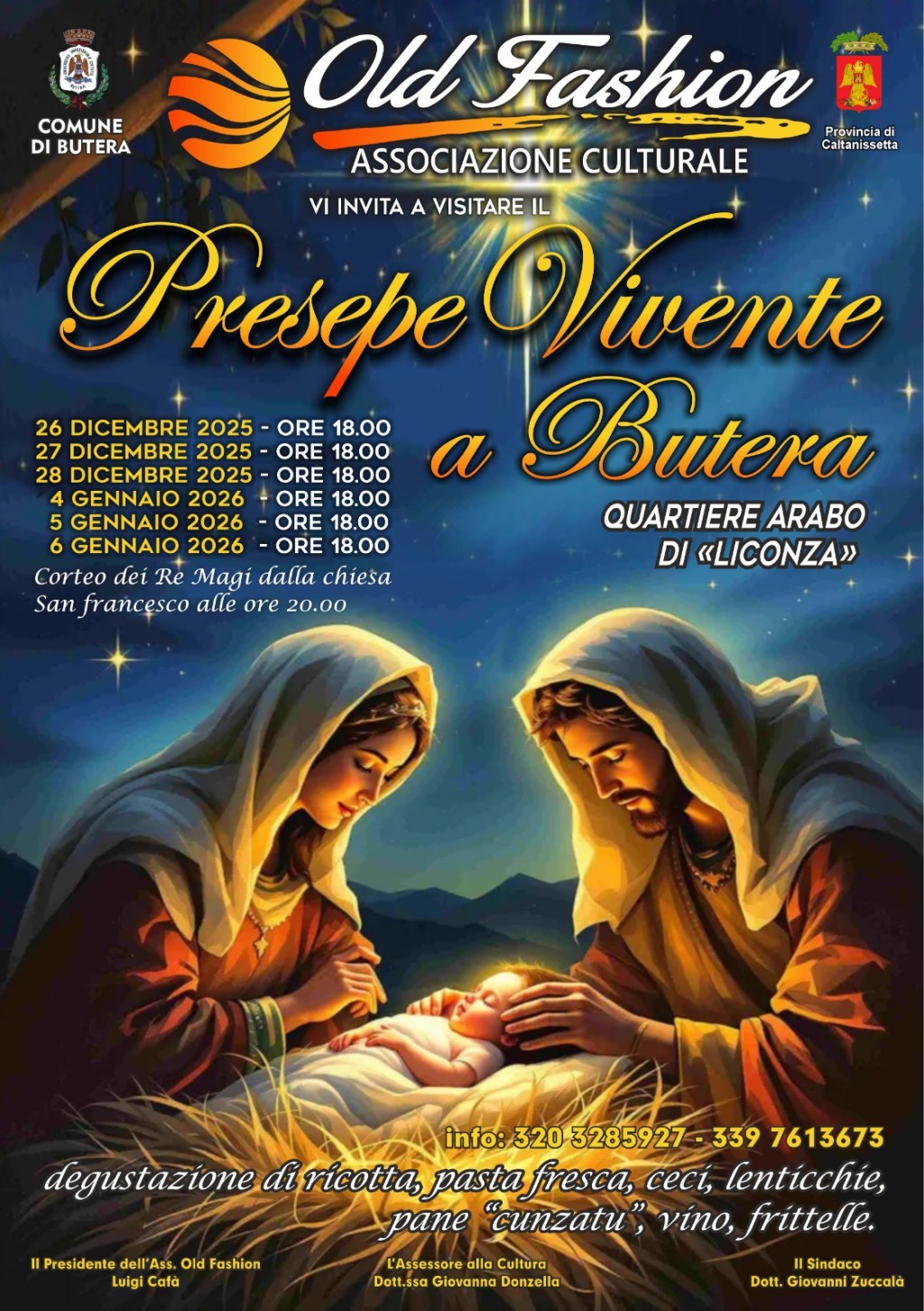 Butera si prepara a rivivere la magia del Natale con il suo storico Presepe Vivente giunto alla quindicesima edizione. Un appuntamento che unisce fede, tradizione e identità culturale. L’evento, patrocinato dal Comune di Butera e organizzato dall’associazione Old Fashion, si svolgerà in sei date: dal 26 al 28 dicembre e dal 4 al 6 gennaio, con inizio a partire dalle ore 18:00.