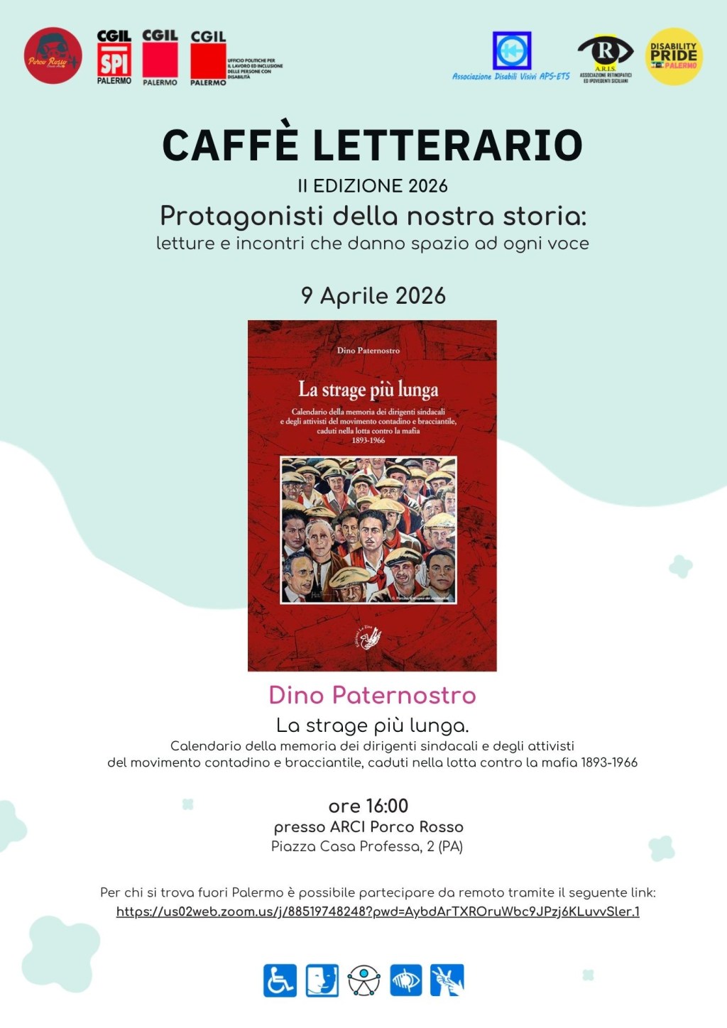 La presentazione del “calendario della memoria” con le storie dei singoli dirigenti sindacali, strumento utile di approfondimentro curriculare in particolare per le scuole secondarie, sarà anche occasione per confrontarsi sulla tematica della rivalsa e dell’ emancipazione da contesti sociali violenti e mafiosi. Il ciclo di eventi della seconda edizione del Caffè Letterario è organizzato da Associazione Disabili Visivi, Arci Porco Rosso, Cgil Palermo, Spi Cgil Palermo, Cgil ufficio politiche per il lavoro e inclusione delle persone con disabilità, Associazione Retinopatici e Ipovedenti Siciliani, Disability Pride.