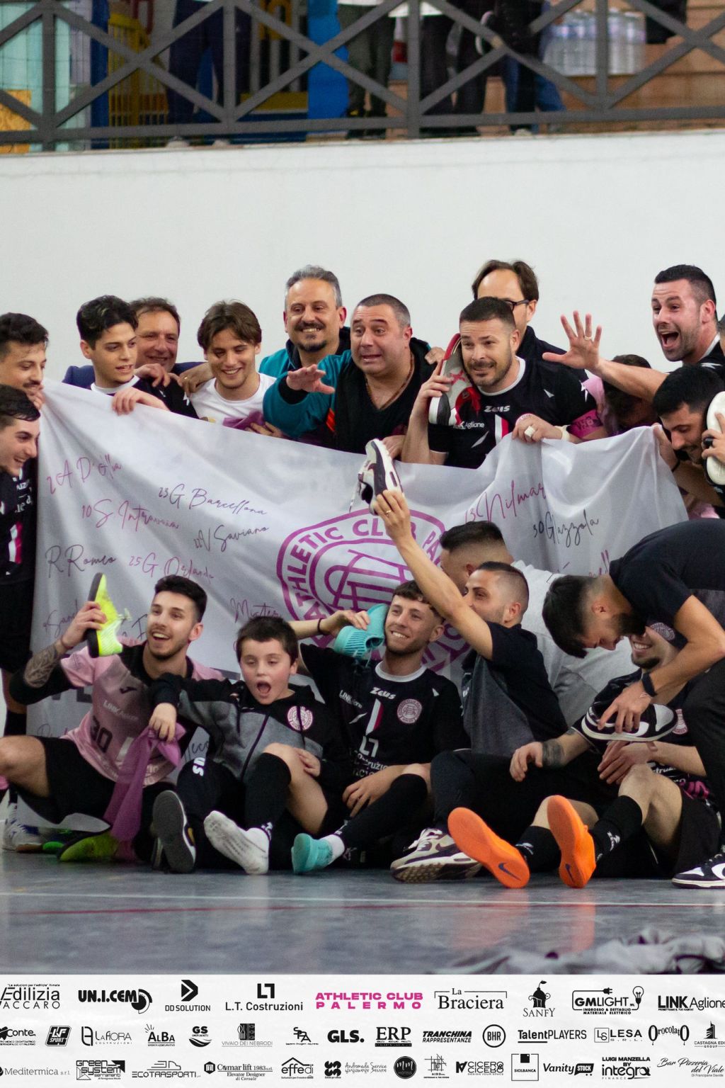 Giornata di festa per l’ Athletic Club Palermo che entra nella STORIA, battendo oggi pomeriggio 6-1 al Palasampognaro di Ficarazzi il Palermo Futsal 89ers, la formazione nerorosa del Presidente Gaetano Conte vince ufficialmente il GIRONE A del Campionato Regionale di SERIE C1 ed e’ PROMOSSO ufficialmente ad una giornata dal termine nel Campionato Nazionale di SERIE B.